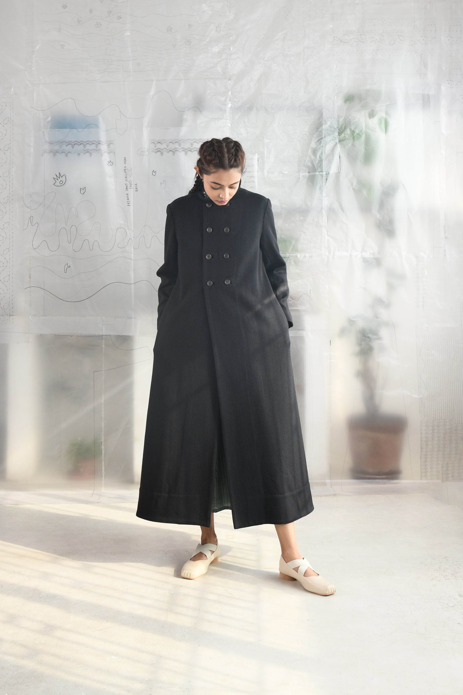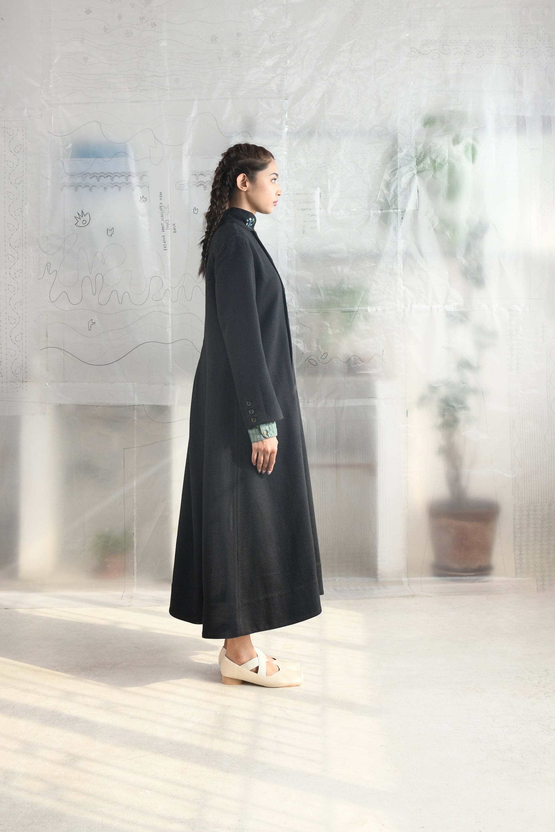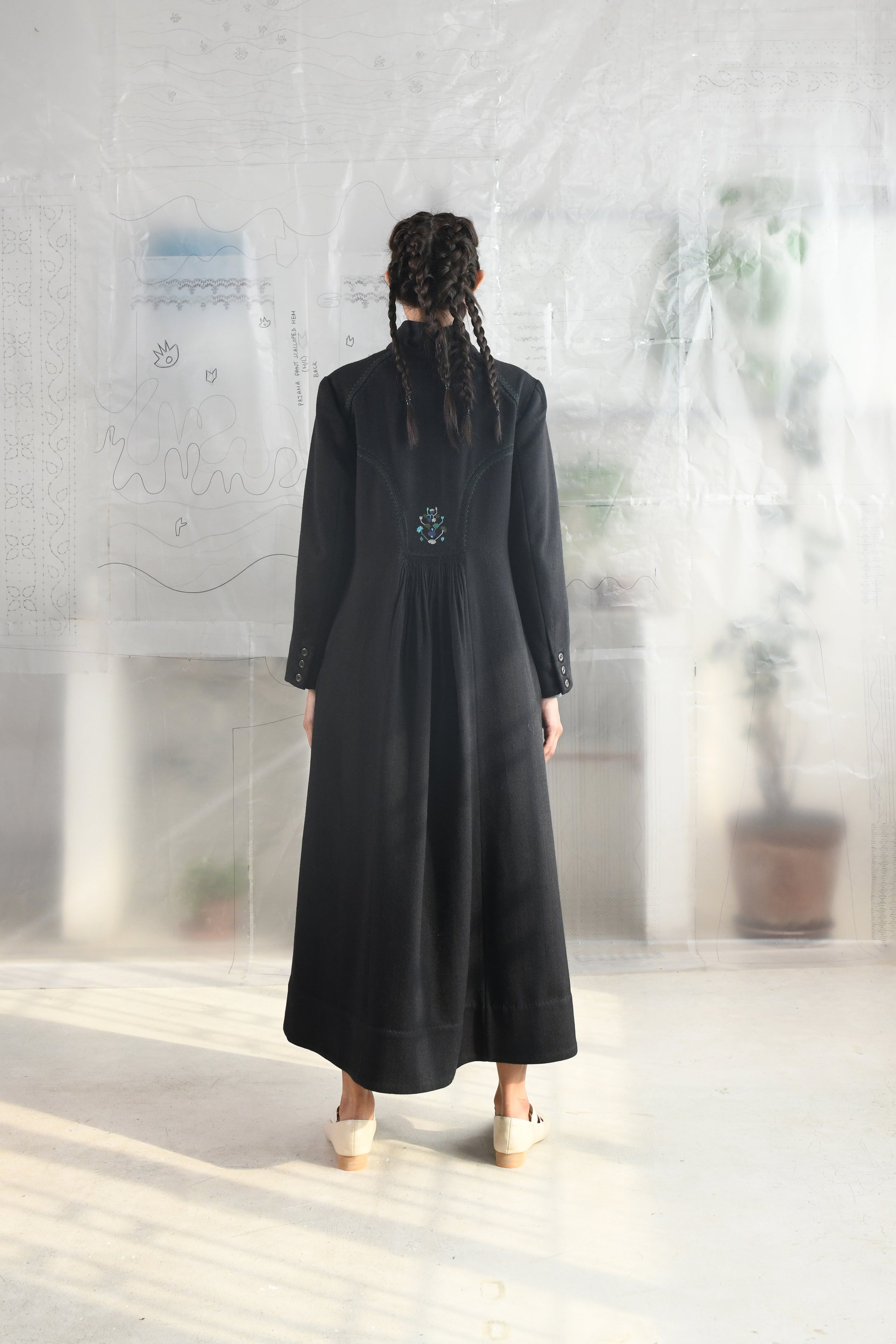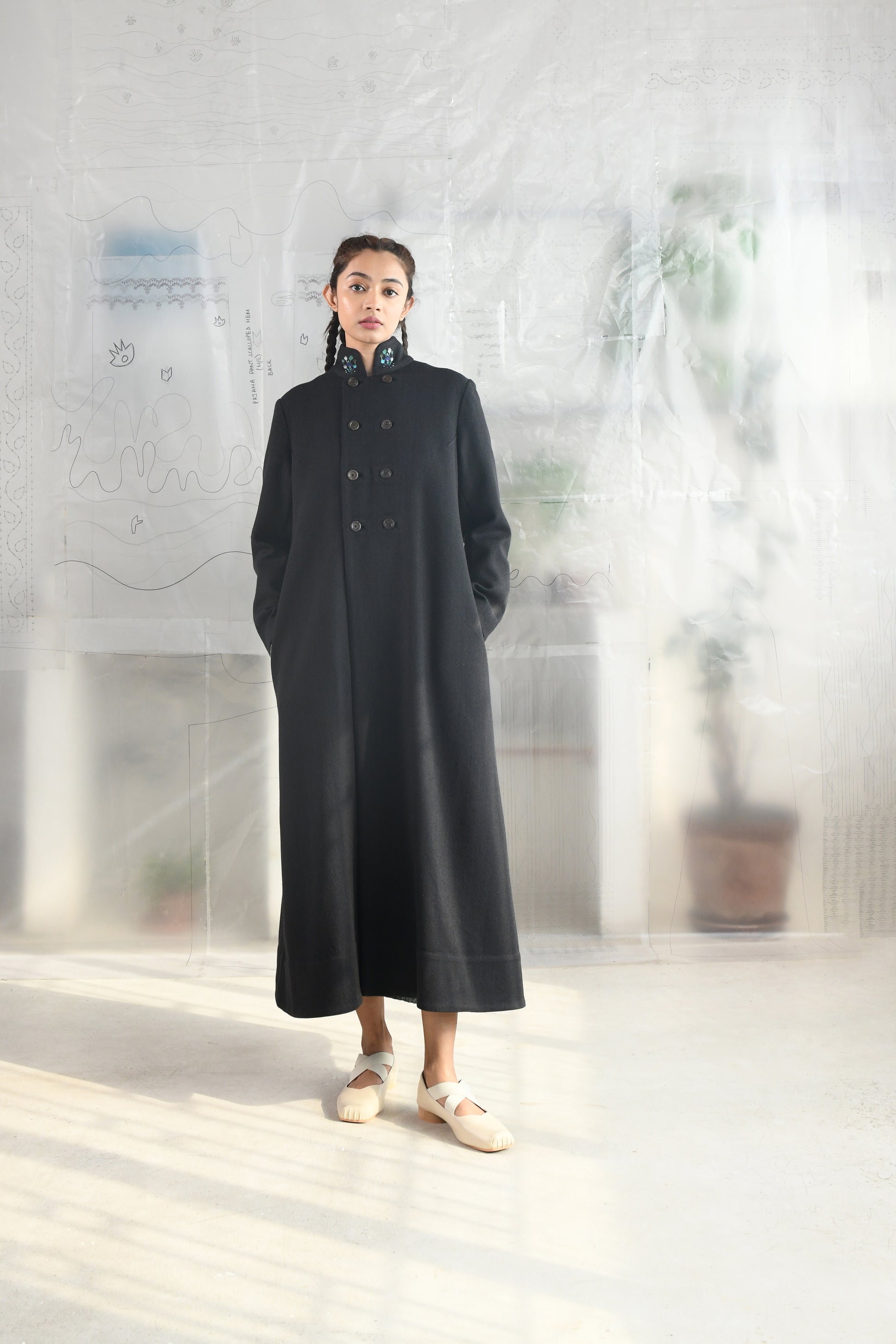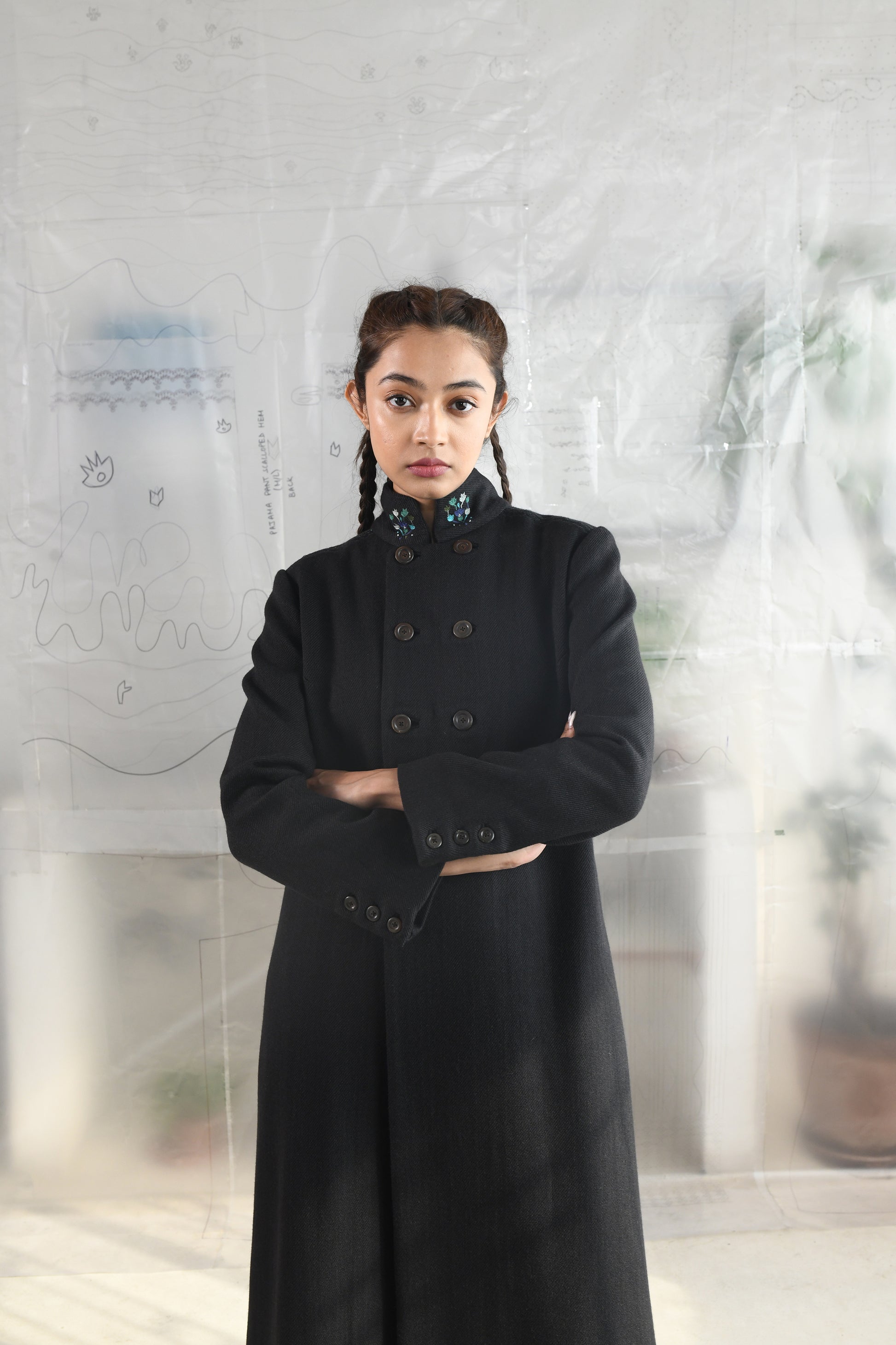 A double breasted handwoven woollen twill jacket with a front overlap button closure, a broad mandarin collar highlighted with hand embroidered motifs, embroidered shoulder seams, full length two piece jacket sleeves with button closure detail, an hand embroidered back with smocking at the centre waist level and side in-seam pockets.