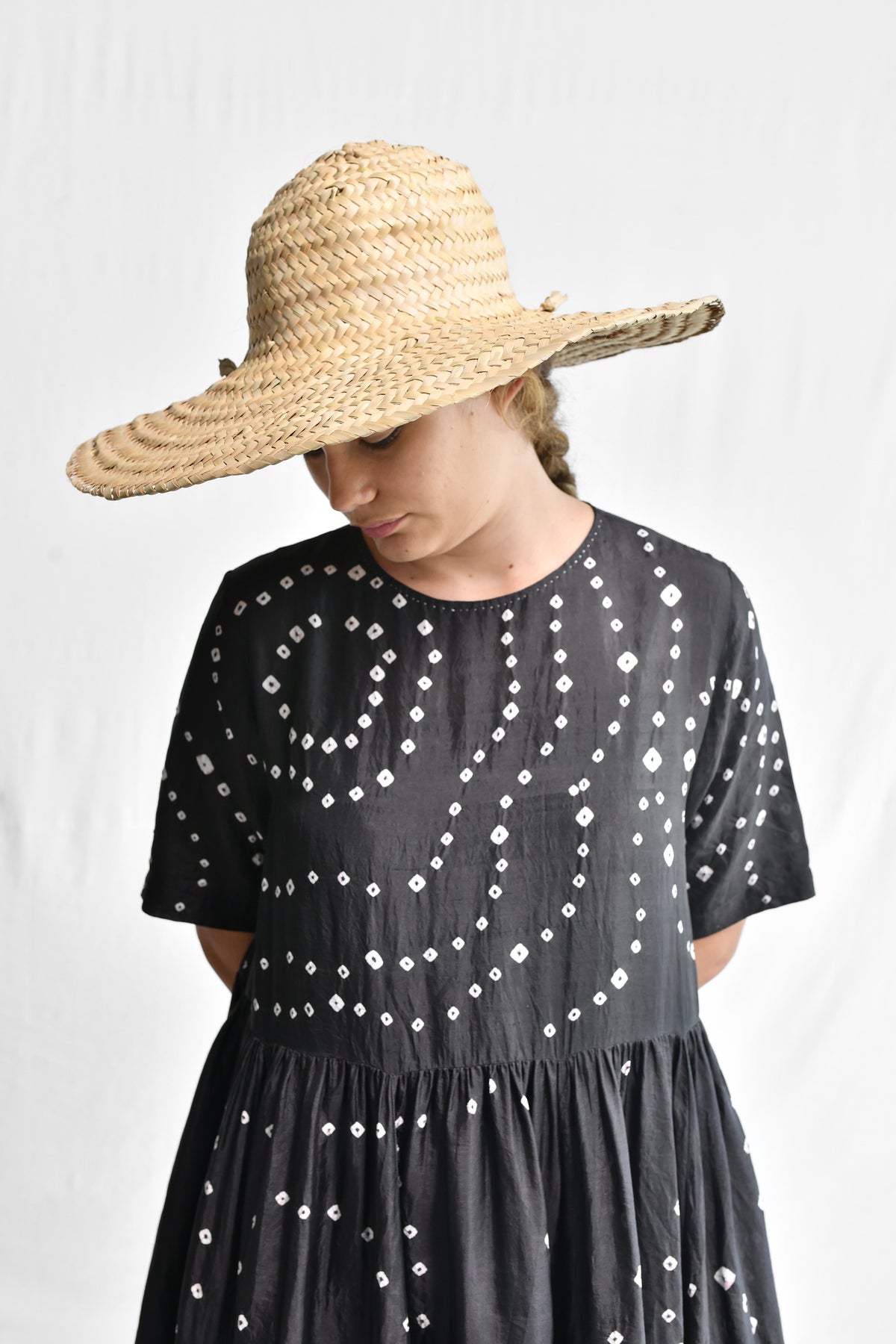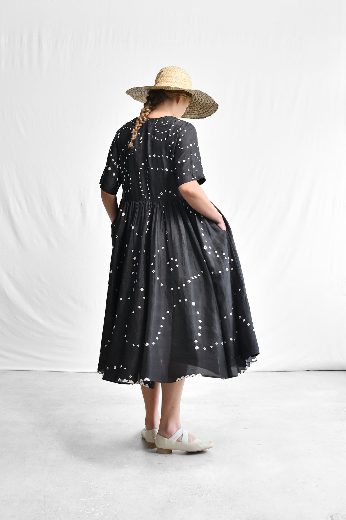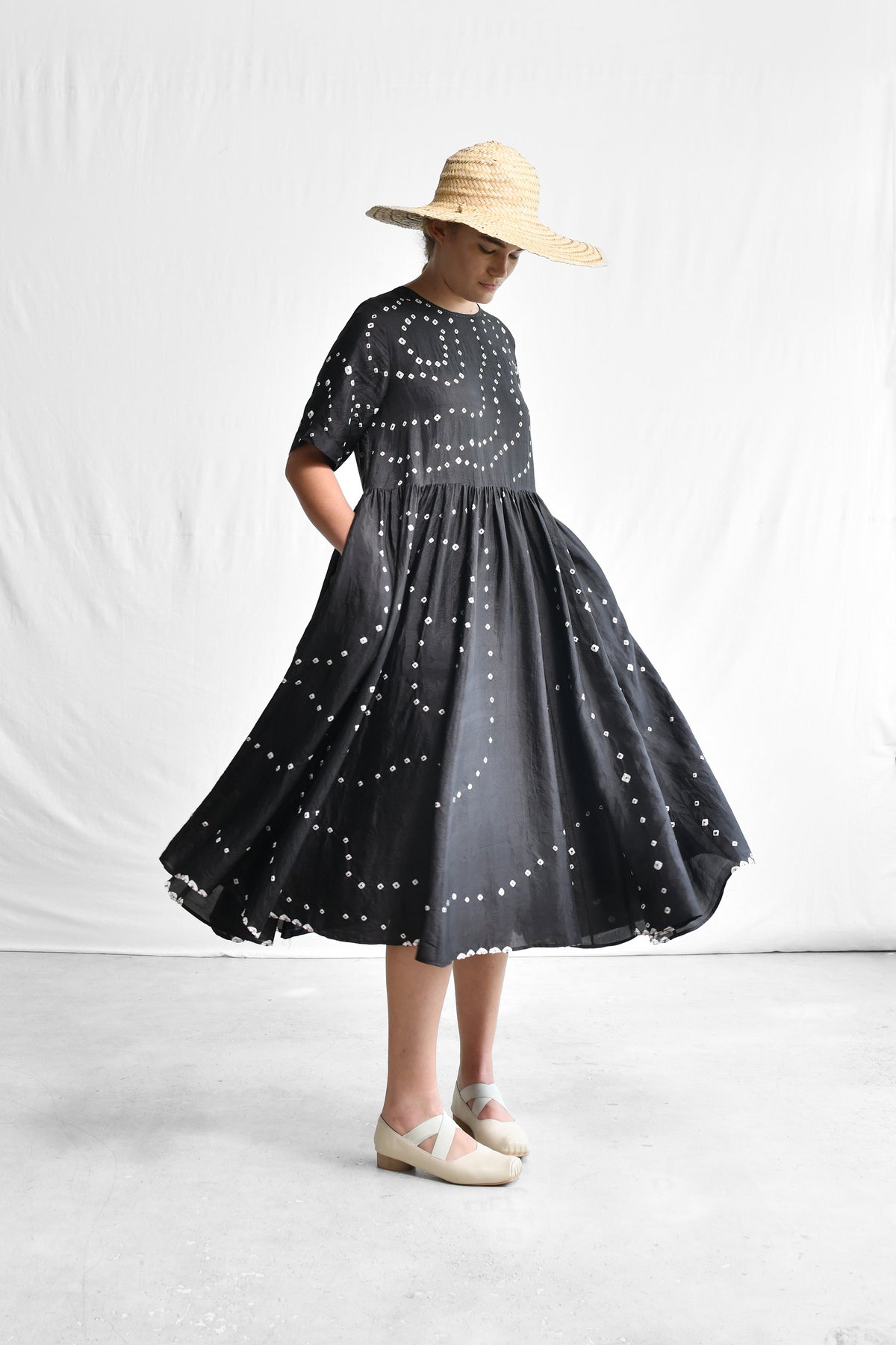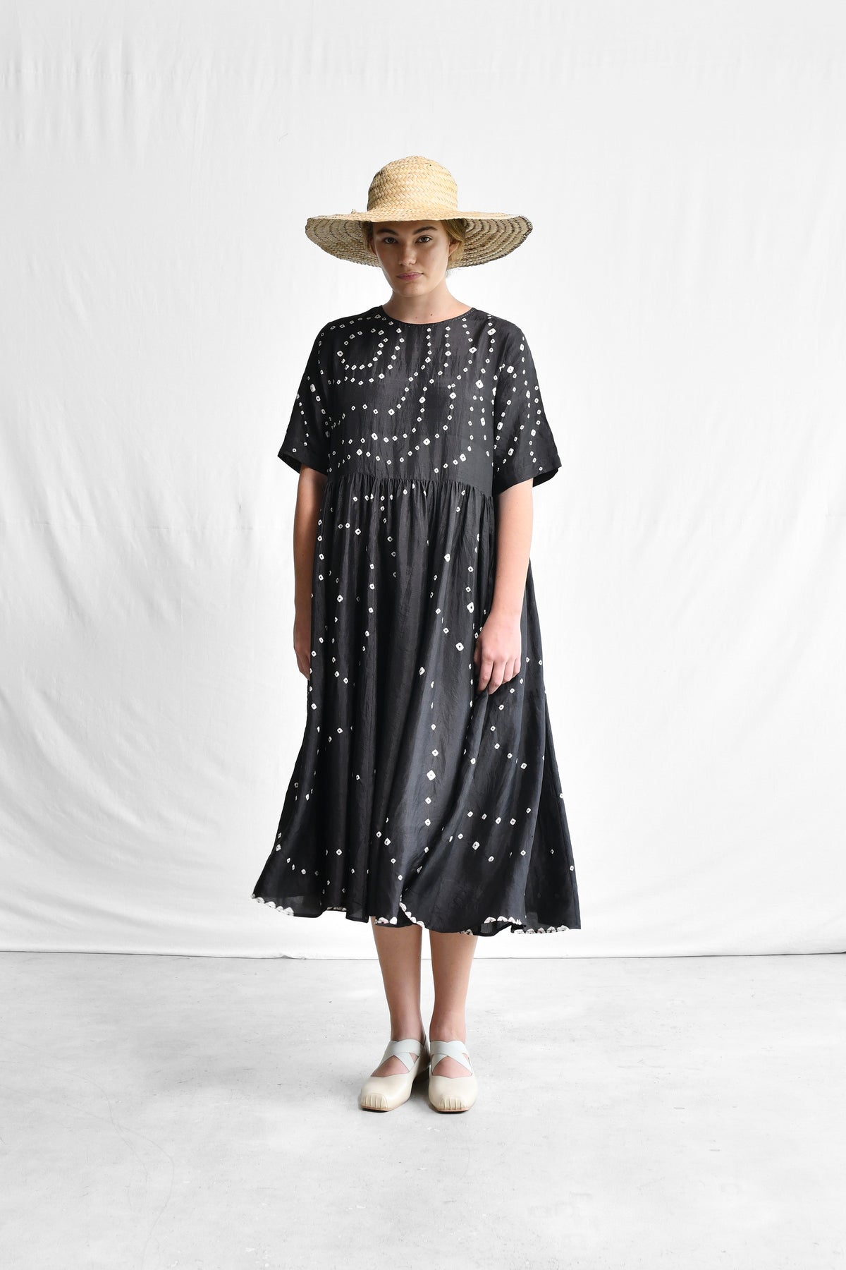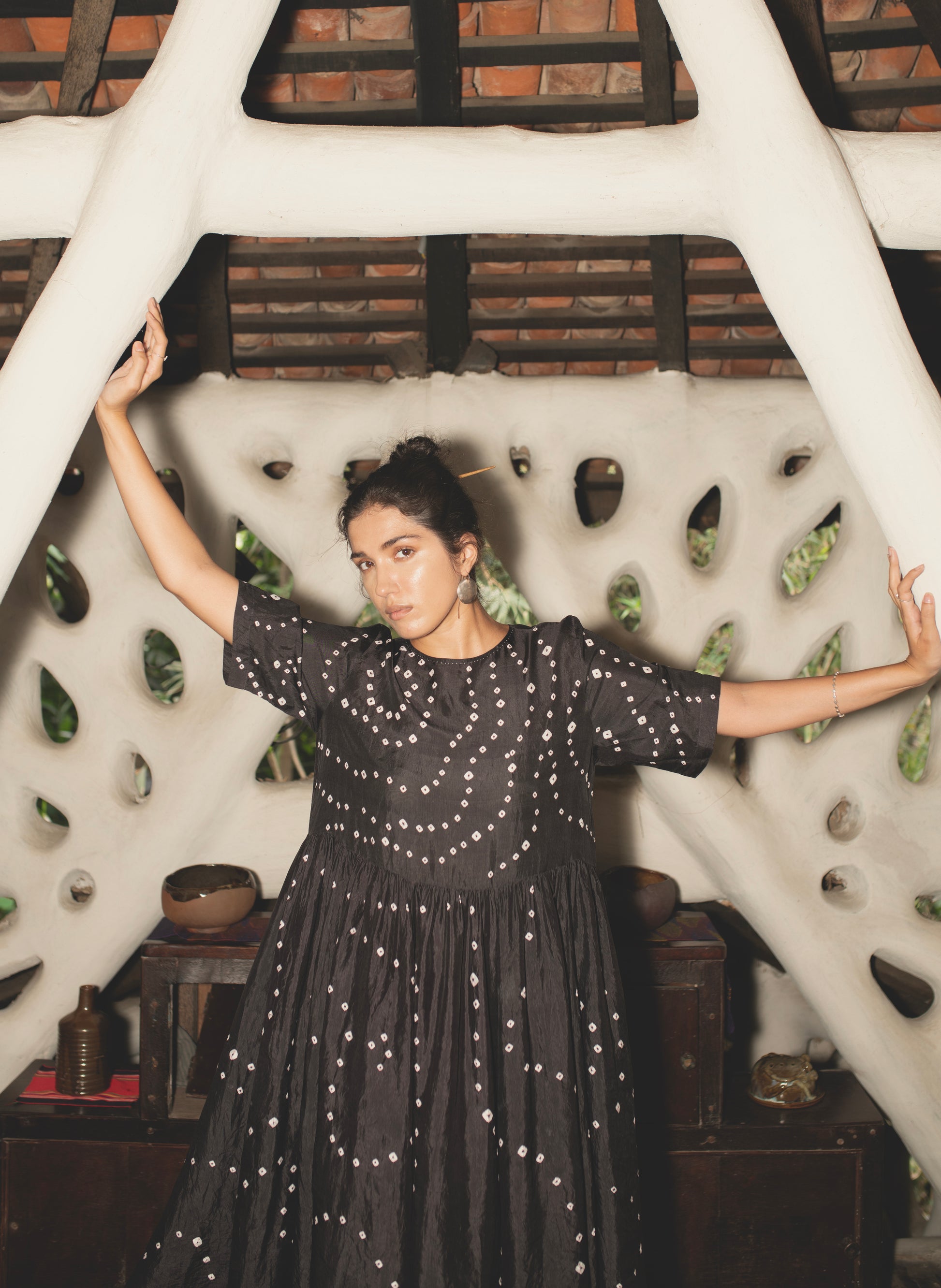 An loose fit hand reeled mulberry silk bandhani dress in deep indigo with a wide round neckline, short sleeves, yoke uptil low waist followed by a gatherred flair fall, a single button closure with a short slit at the back neck and side in-seam pockets.