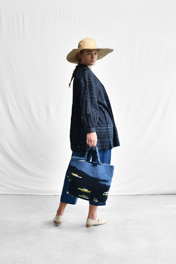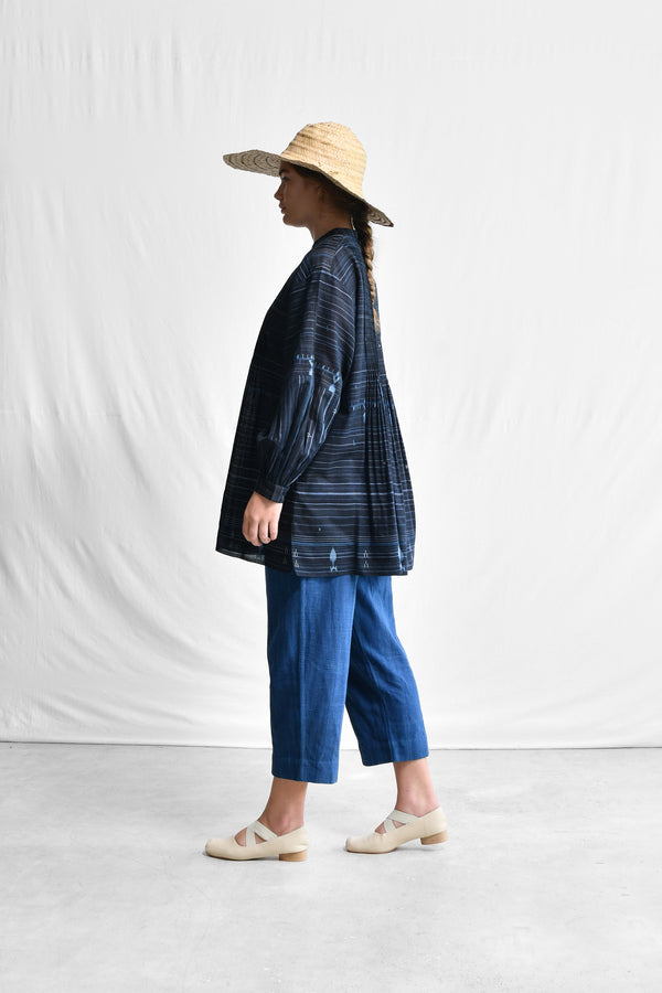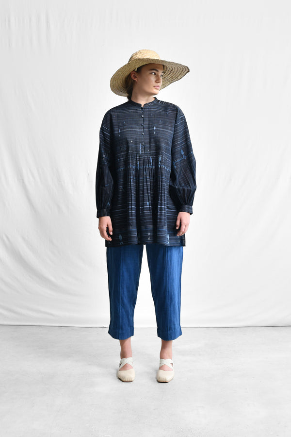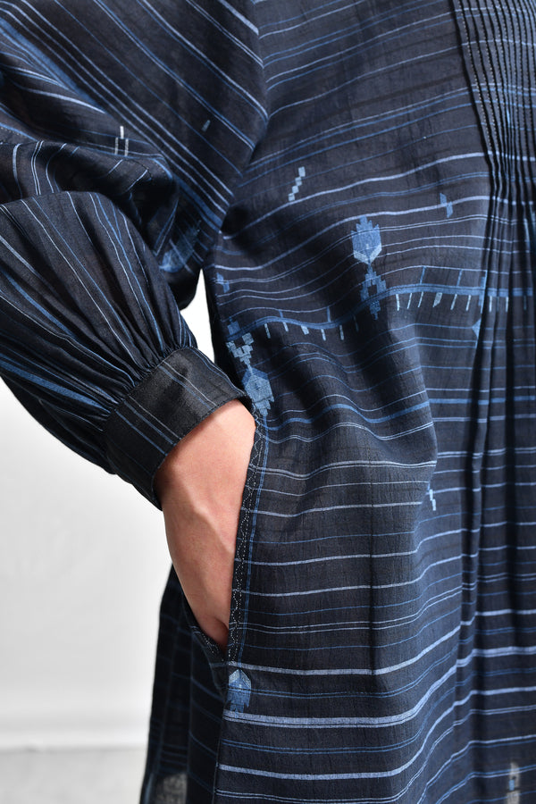 A loose fit, home-spun cotton silk jamdani flair top with a mandarin collar neck line, front button placket opening, finely pleated front and back yoke opening into light gathered fall, full length sleeves with a cuff, side short slits and a selvedge hem.