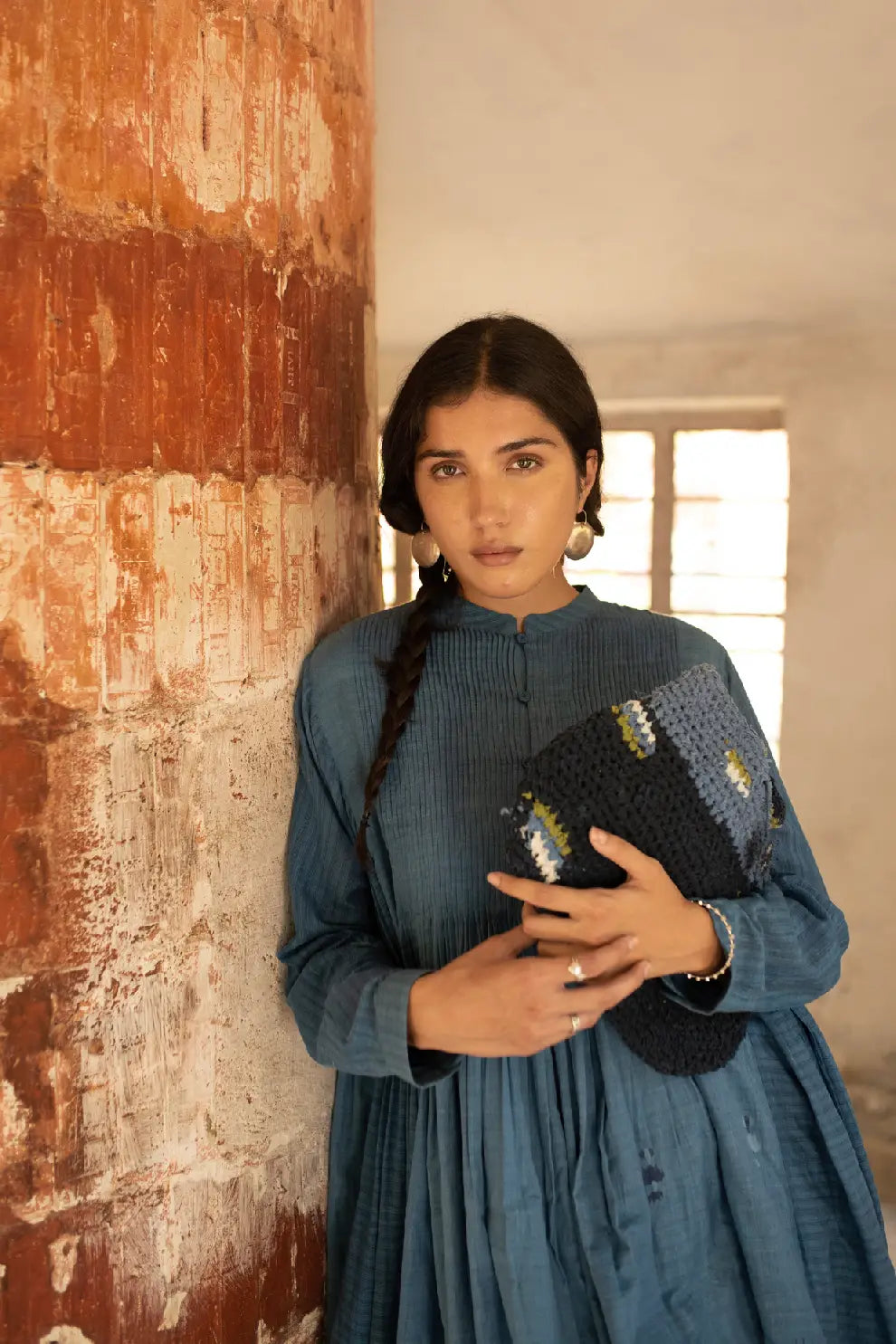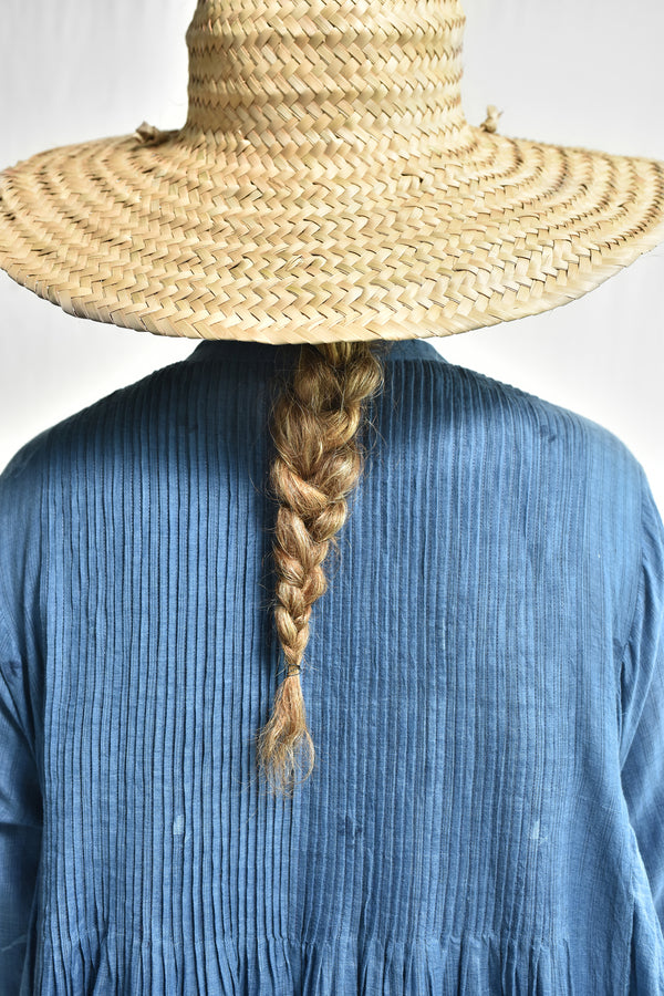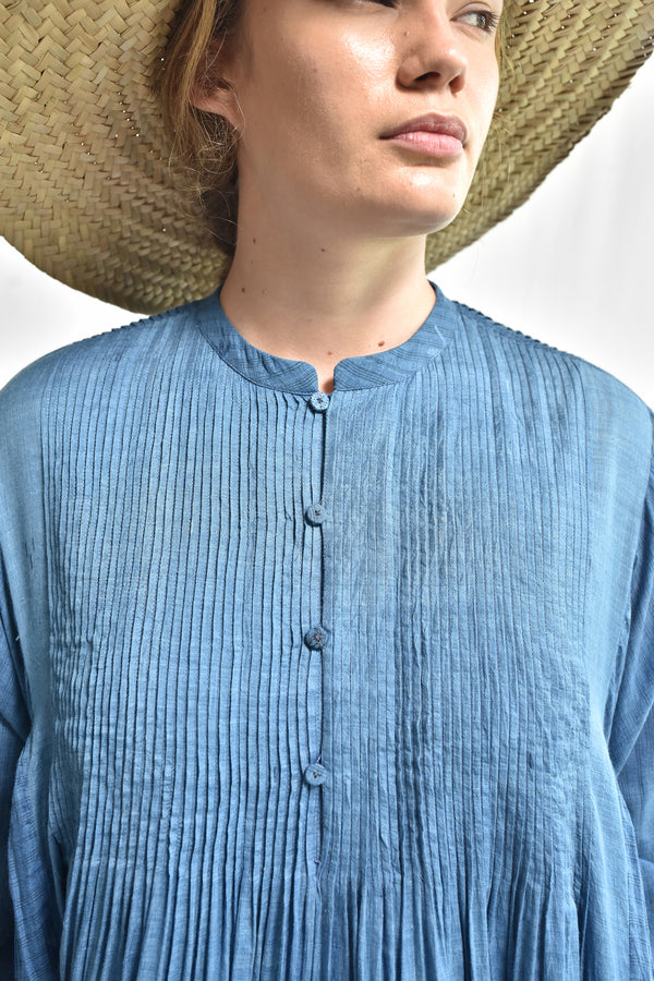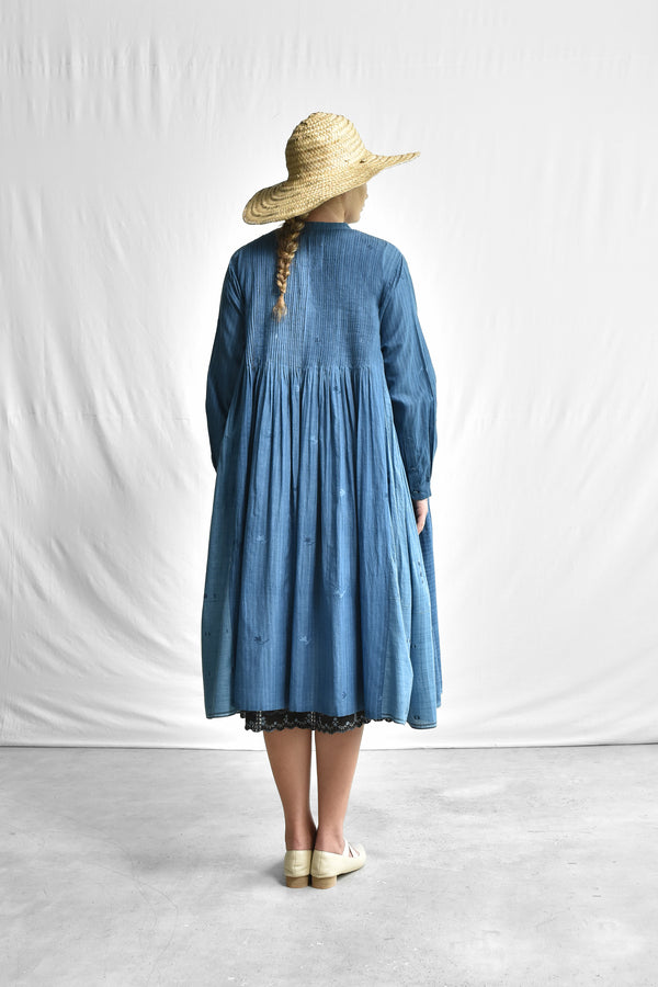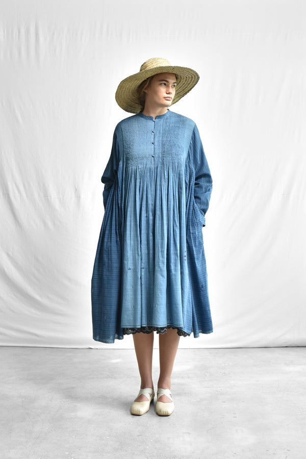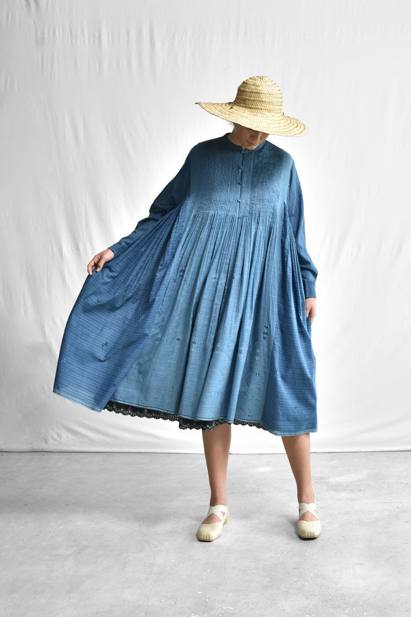 A flair, multi panel, handwoven silk cotton jamdani dress with a round mandarin collar neck, a front button loop opening, fine pleats on both front and back uptill waist opening into a gathered flair, gathered panels on the sides under the armhole, full length kimono sleeves with faggoting detail, cuffs with button placket, selvedge detailed hem and side in-seam pockets.