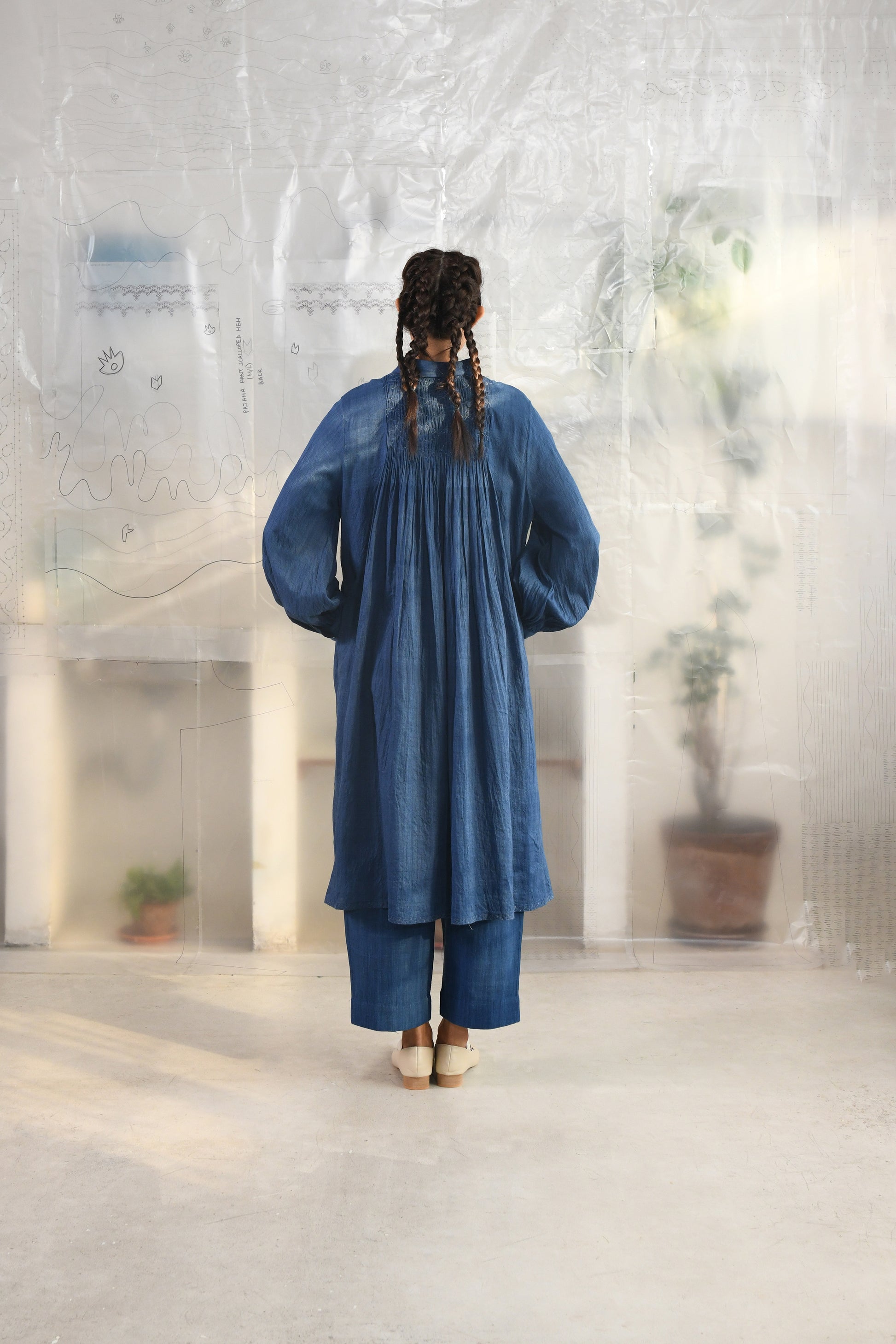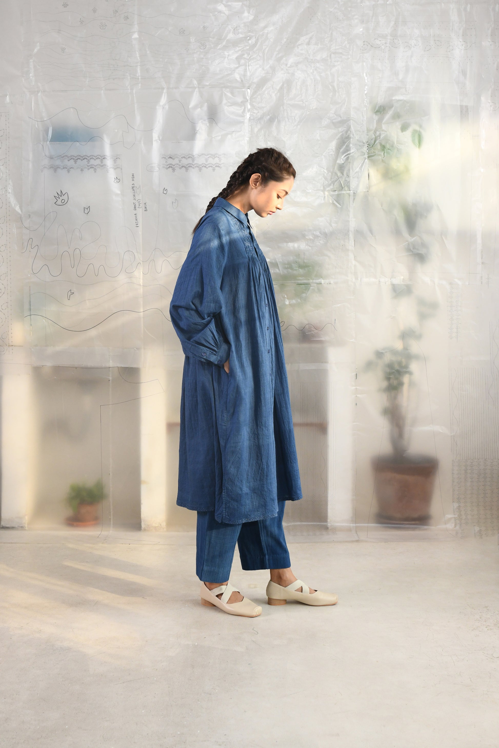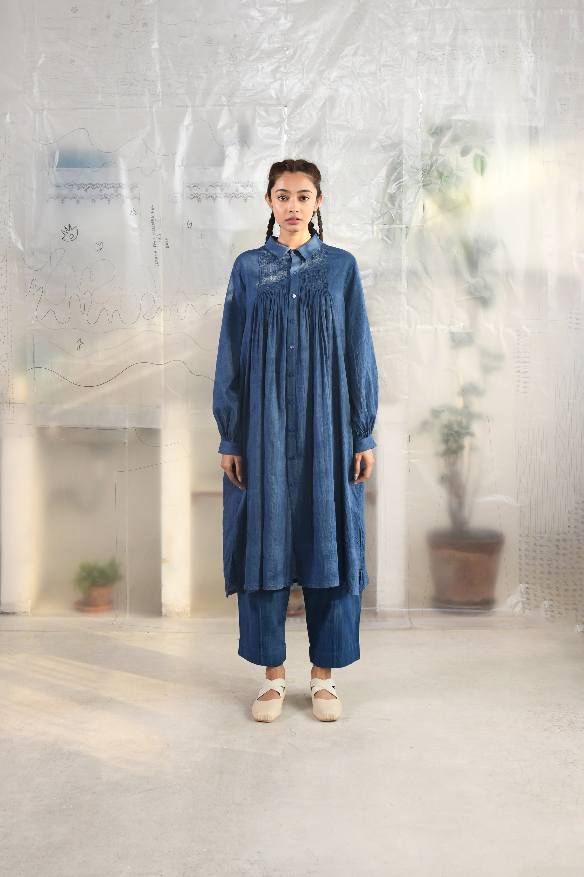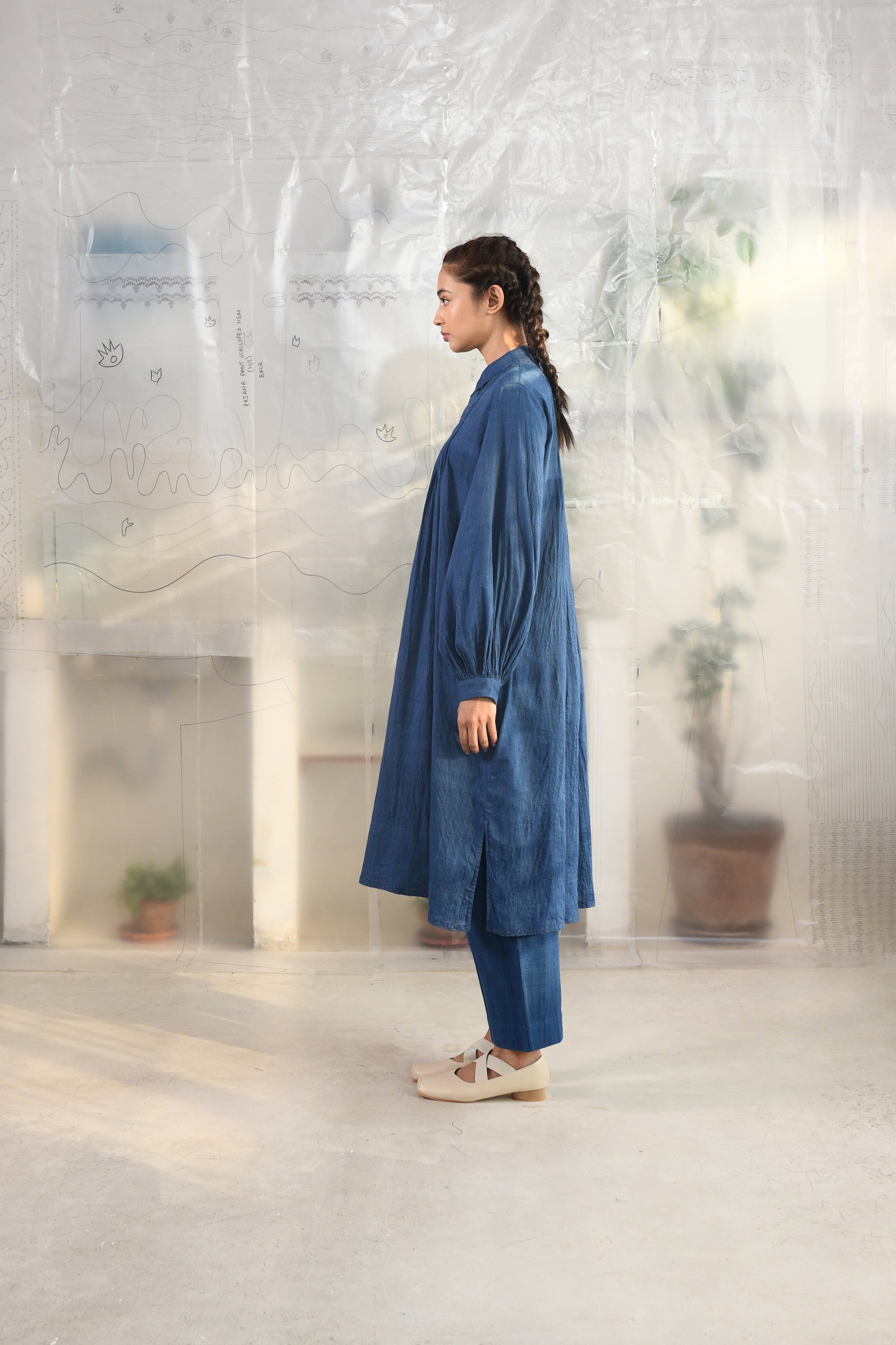 A handwoven very fine wool cotton flared dress with smocking at the front and back secured with embroidery, a shirt collar, button-down front placket closure and volumonous full length gathered sleeves with cuffs.