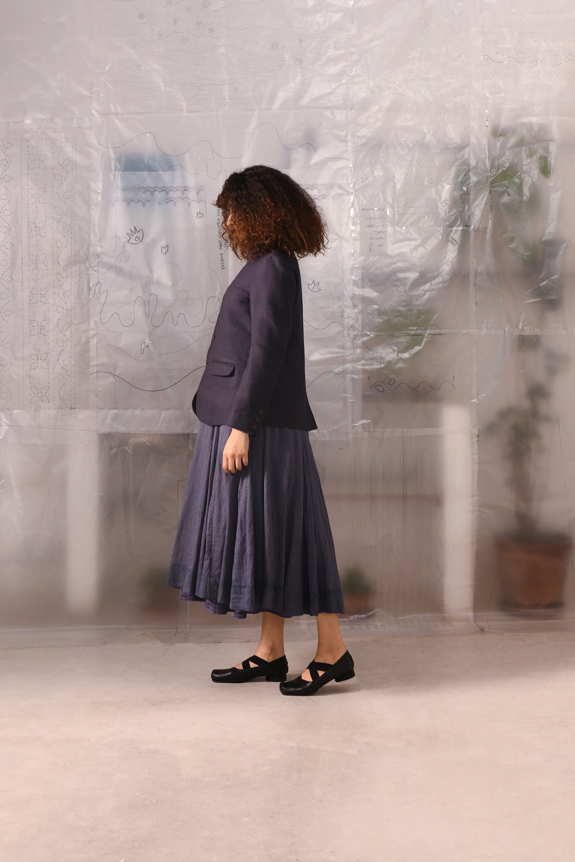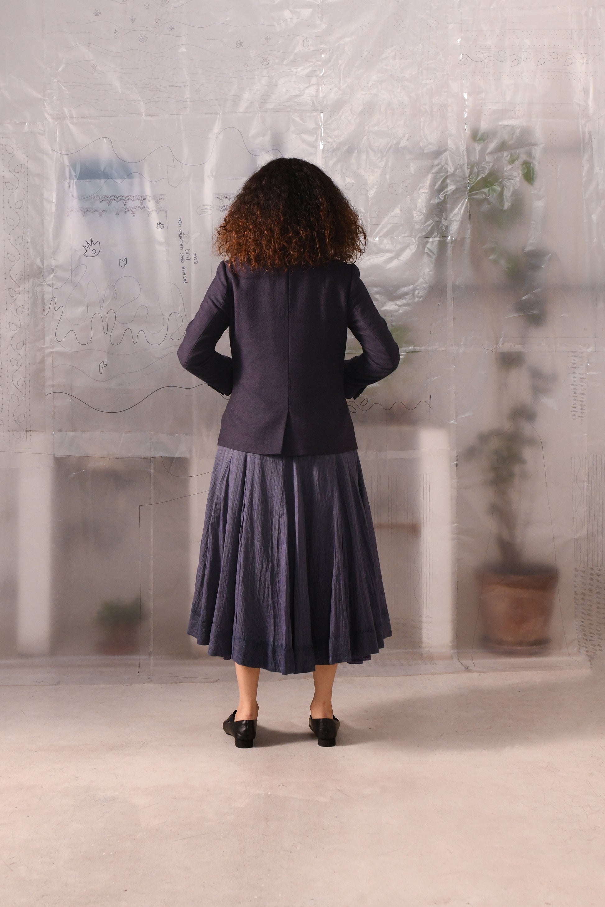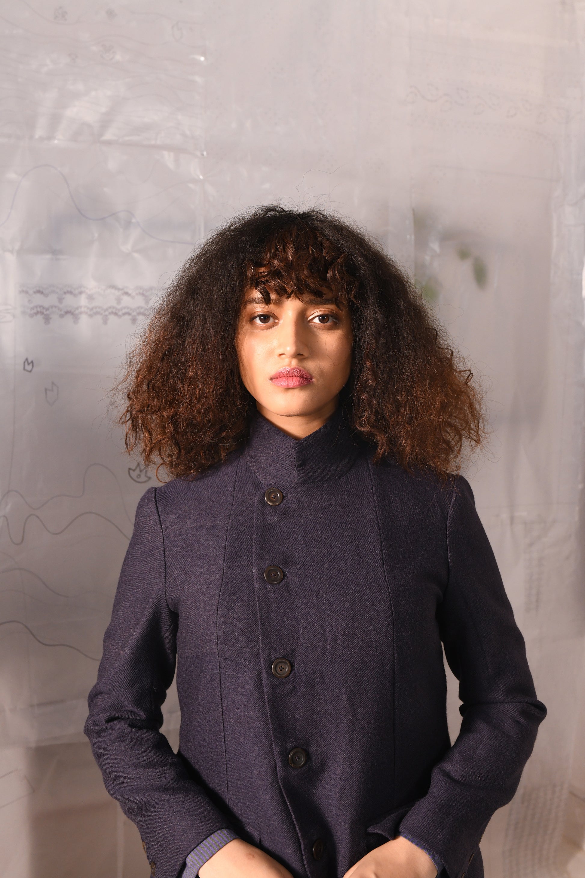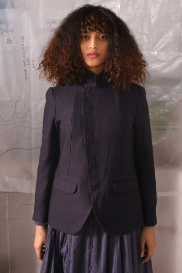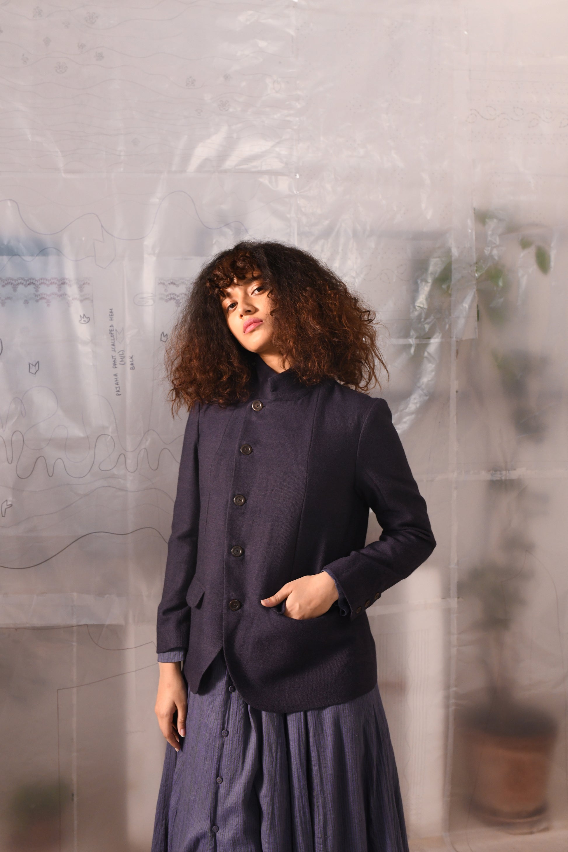 A well-fitted tailored jacket in handwoven woollen twill with a broad stand collar, an overlap diagonal front button closure, front flap pockets, full length two piece jacket sleeves with button closure detail and a vent at the back. The jacket is lined with handwoven silk, detailed with an inside welted pocket.