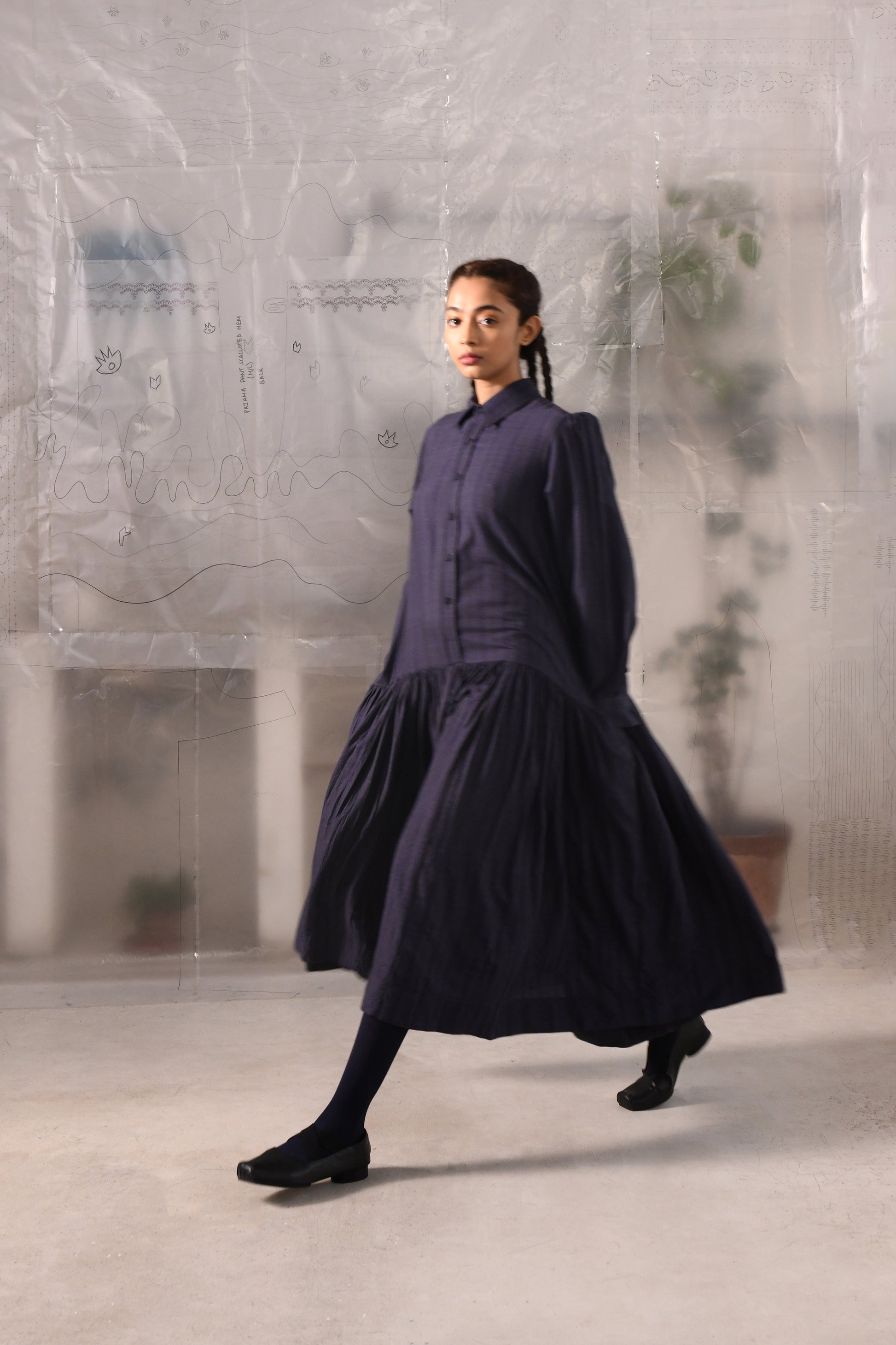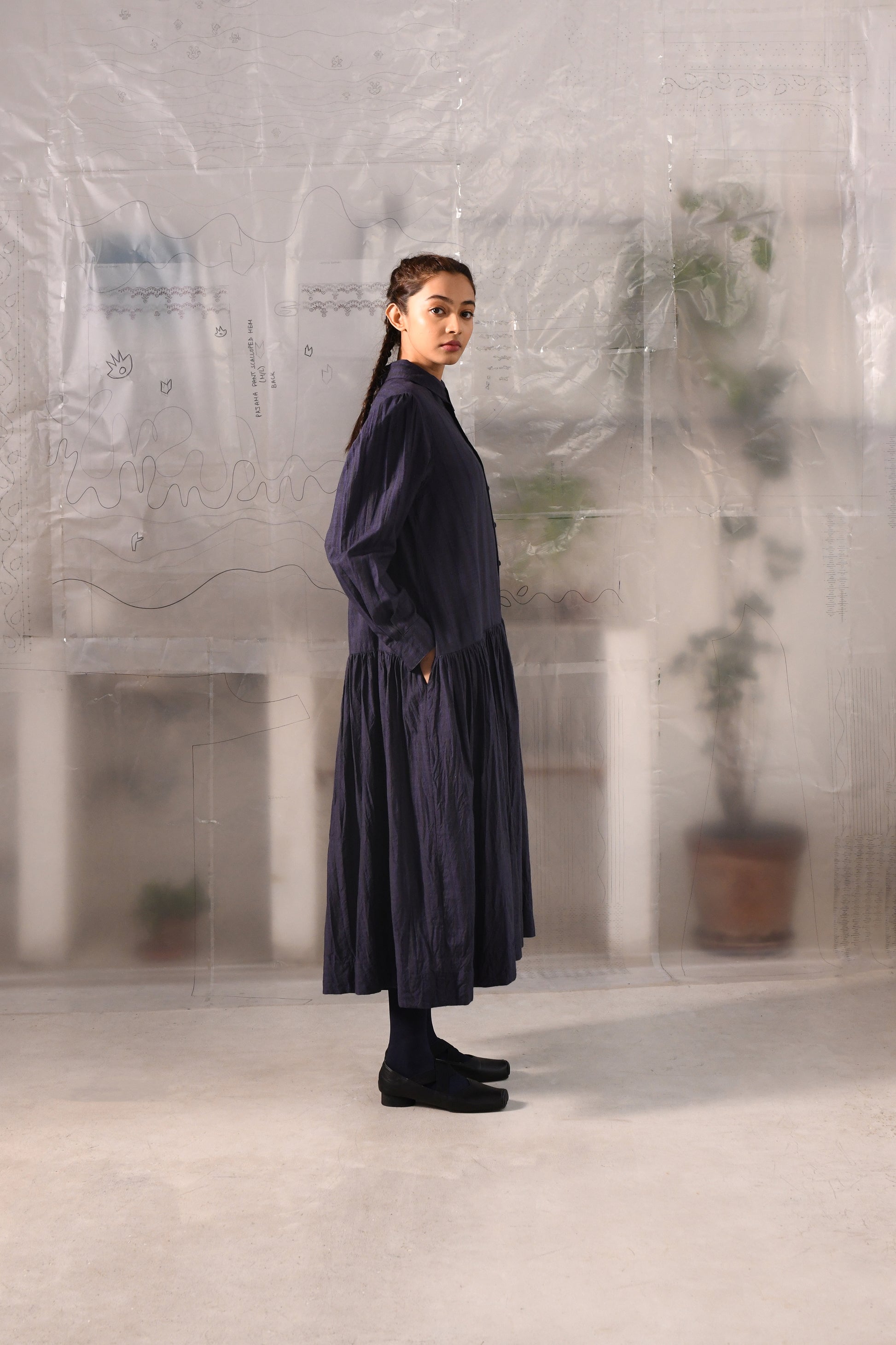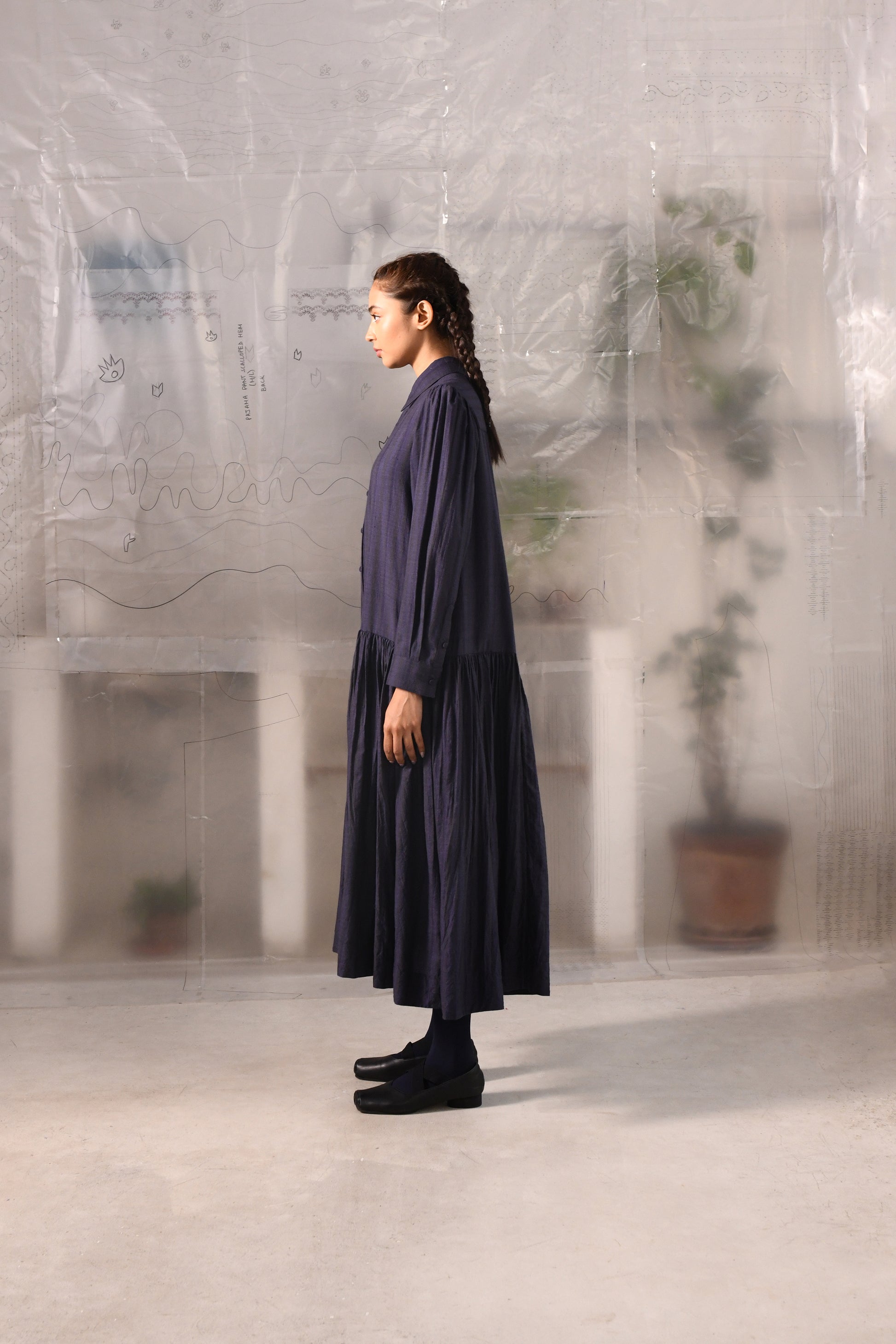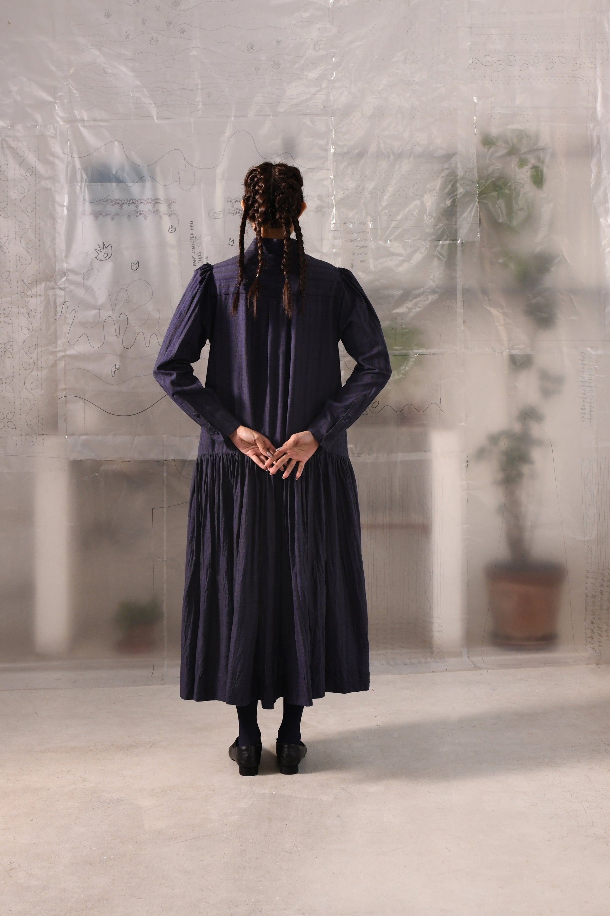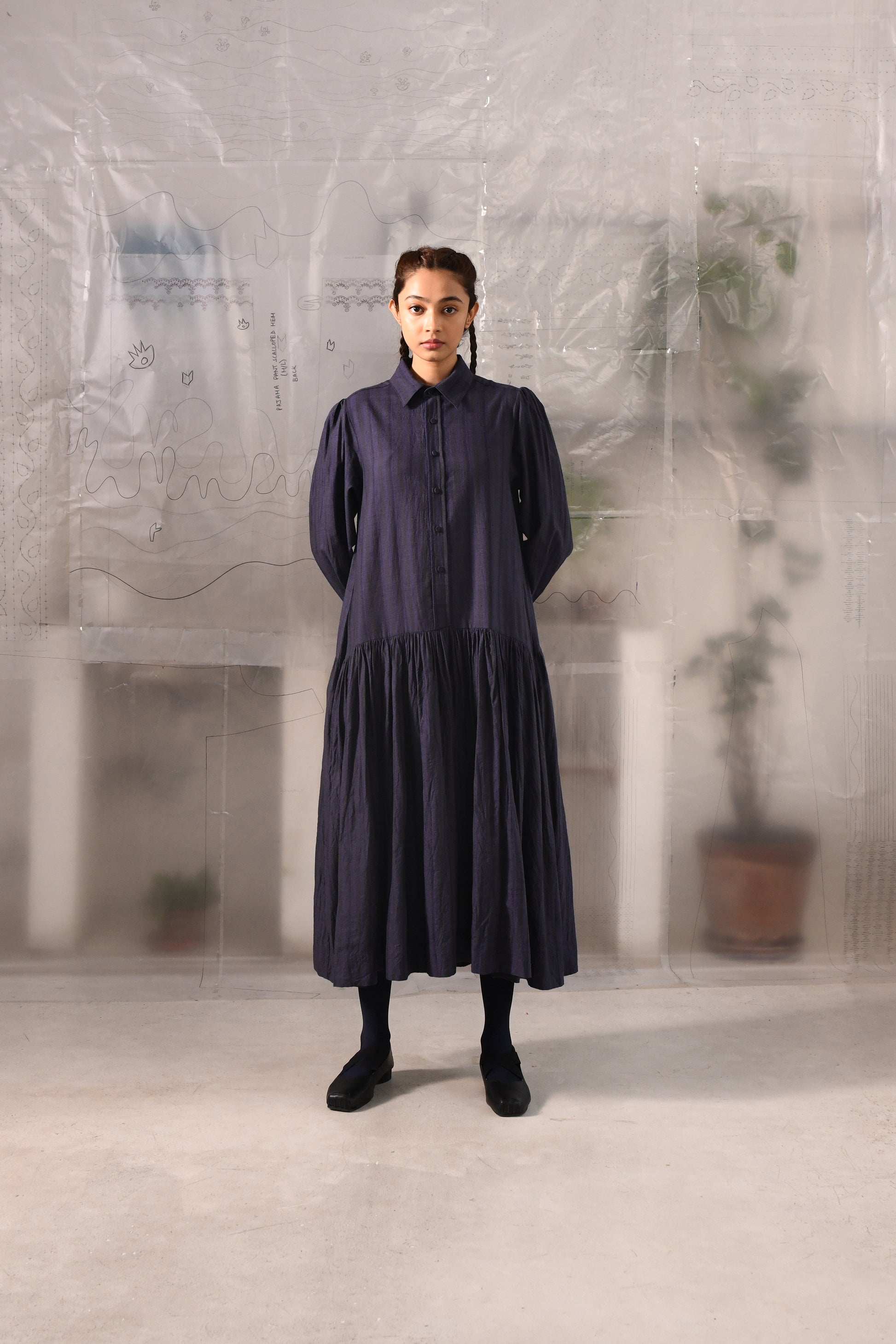 An A-line, dropped waist dress in handwoven striped very fine wool with a shirt collar, full length sleeves with cuffs, center front button down closure till the waist, back yoke with a box pleat, gathered fall and side in-seam pockets.