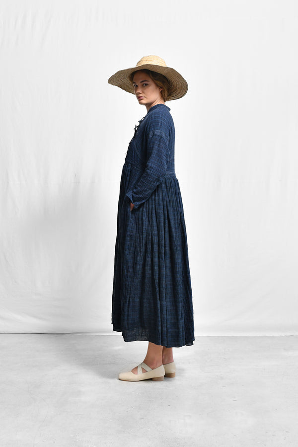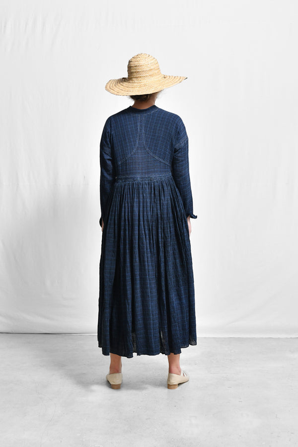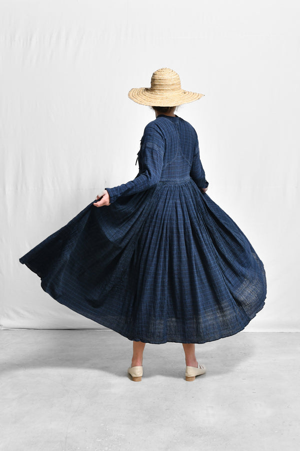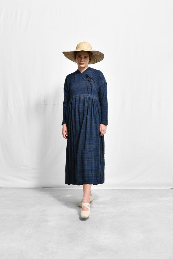 A traditional aang-rakha inspired overlap dress in handwoven checkered crushed cotton with patched raglan sleeve, stand collar, full length sleeves with a slit, smocked fall and side in-seam pockets with fine machine embroidery detail on the patched sleeve and waist. The dress is held together using tie details on the left overlap panel and invisible buttons inside.