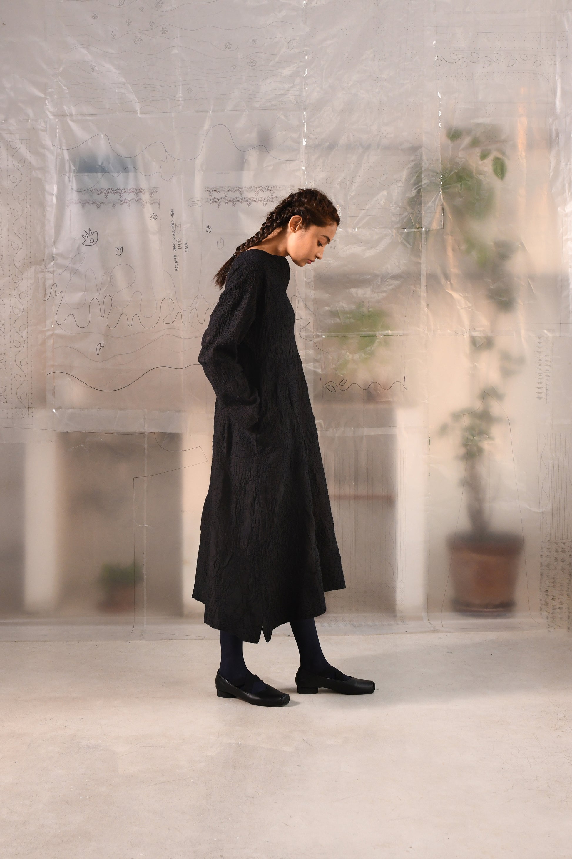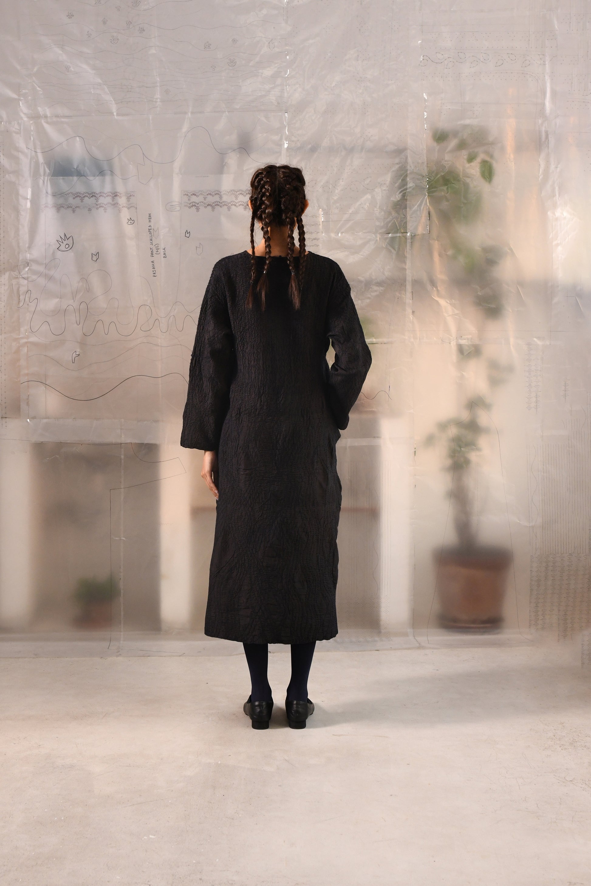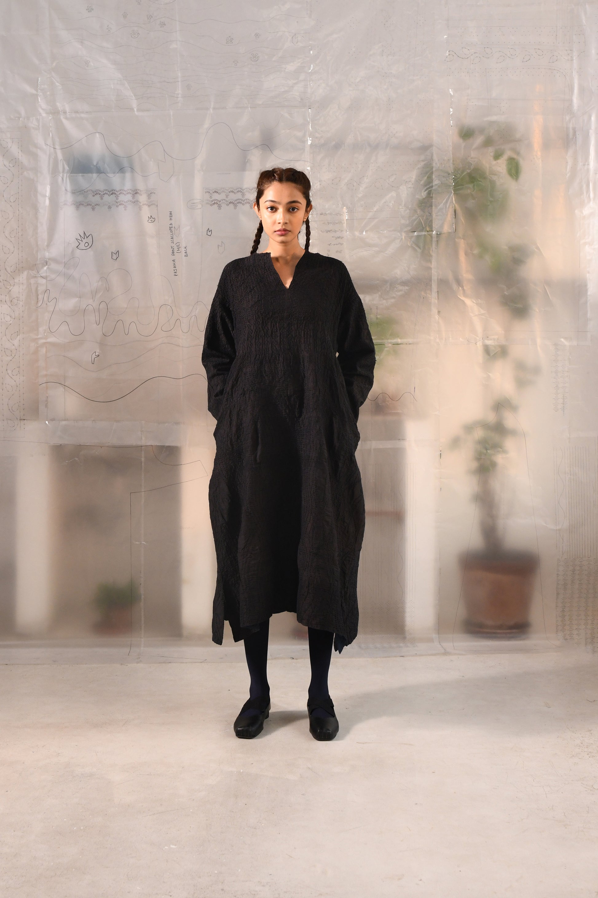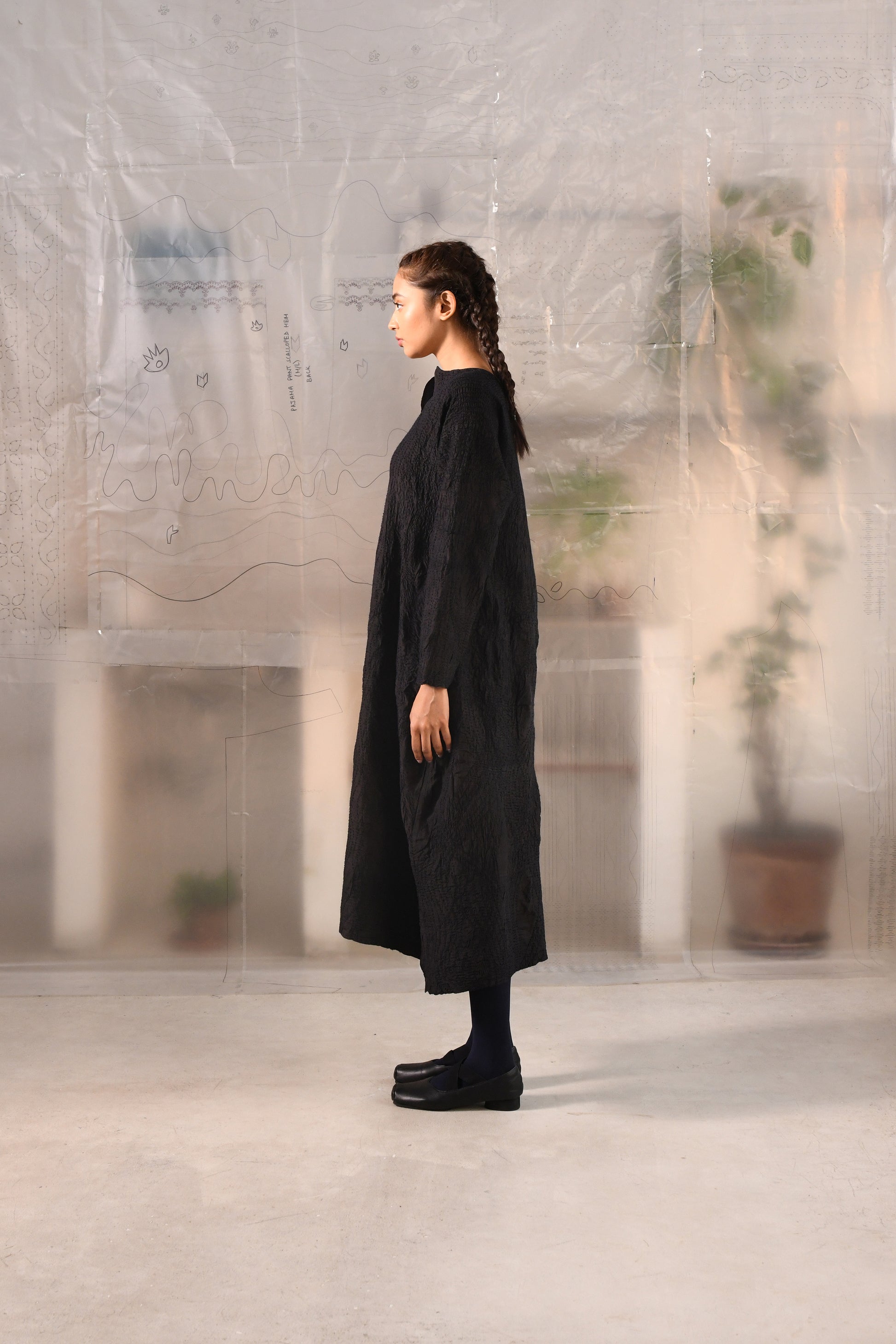 An A-line, long silk dress, distorted with hand quilted using woollen yarns, overdyed in dark indigo with a round neckline with a slit, full length sleeves, side in-seam pockets and shorts slits on the sides.