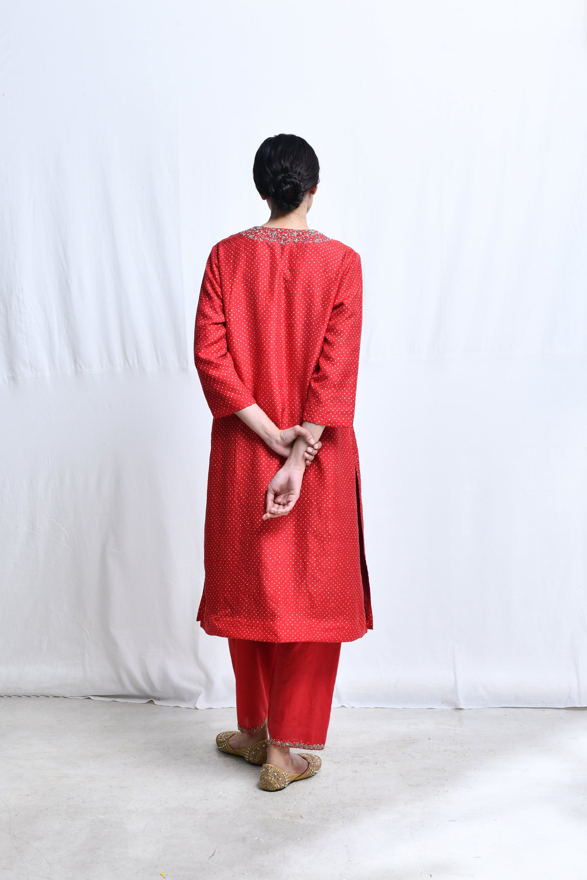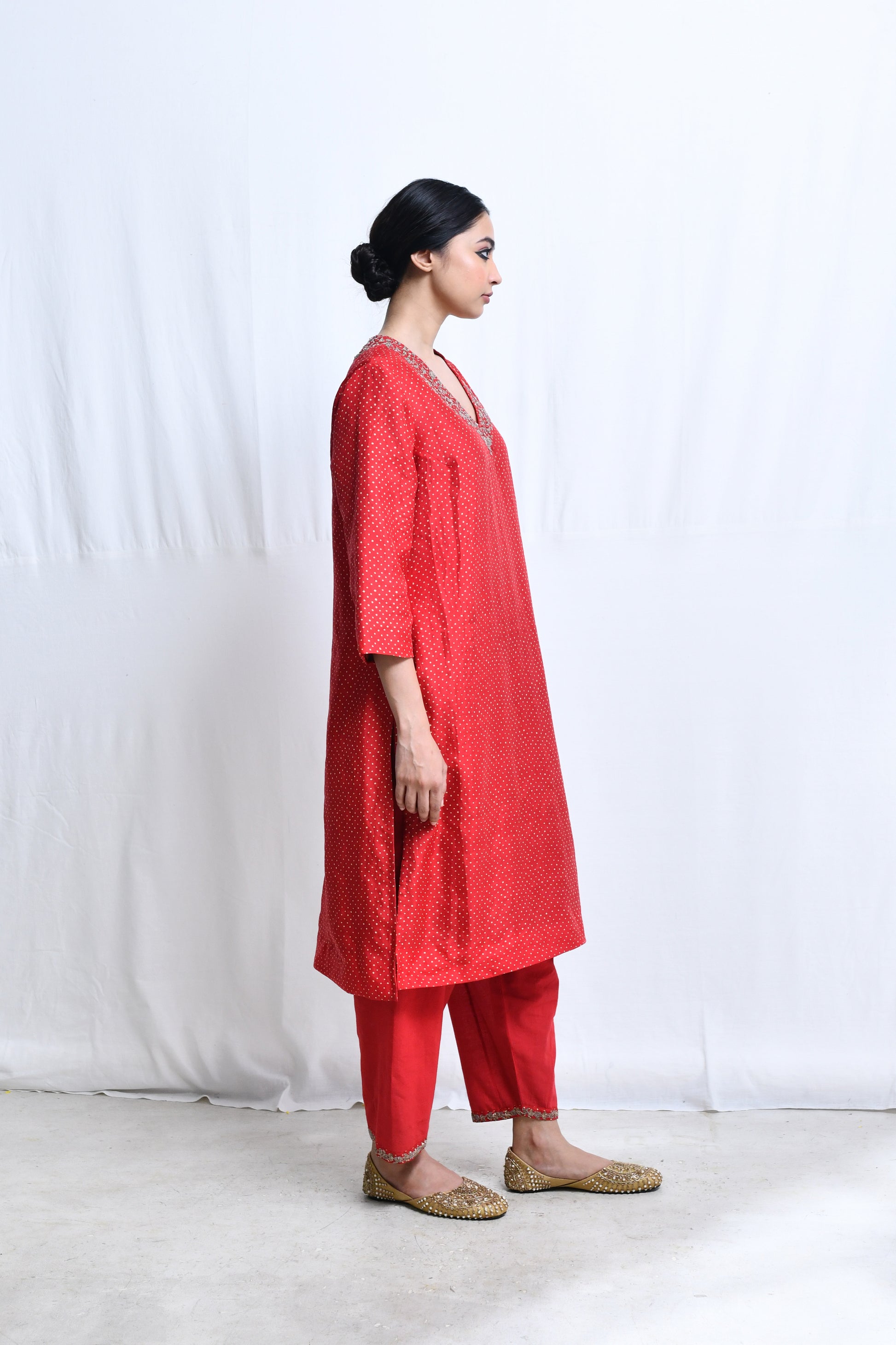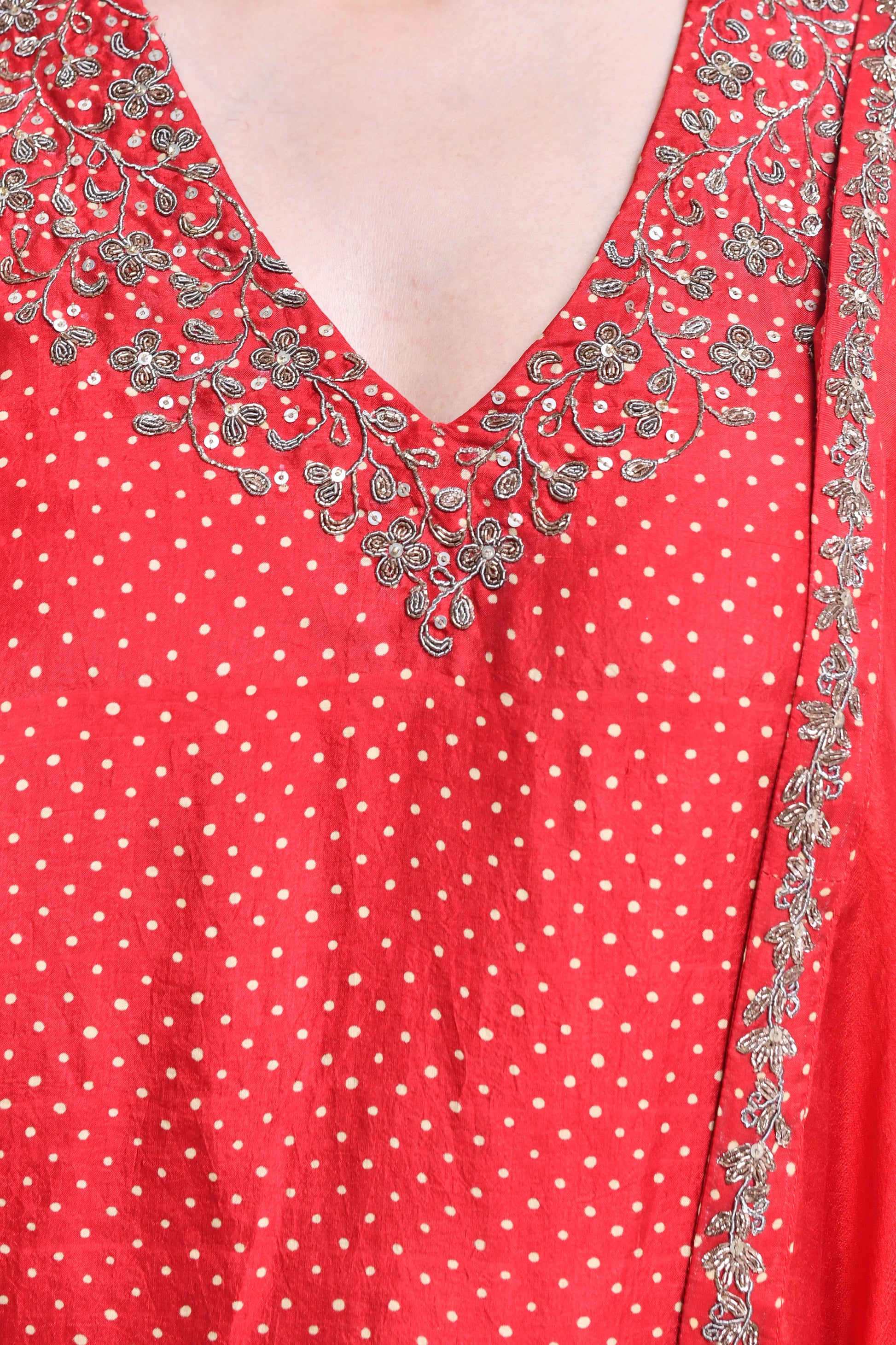 A v-neck, straight cut kameez in homespun polka dotted silk with a heavy zardozi hand embroidery around the front and back neckline, quarter length sleeves and side in-seam pockets.