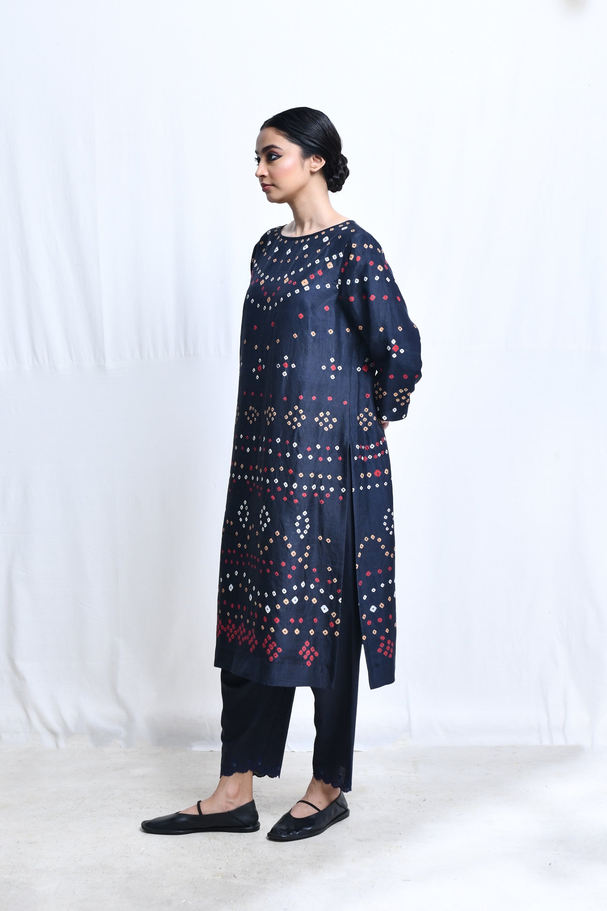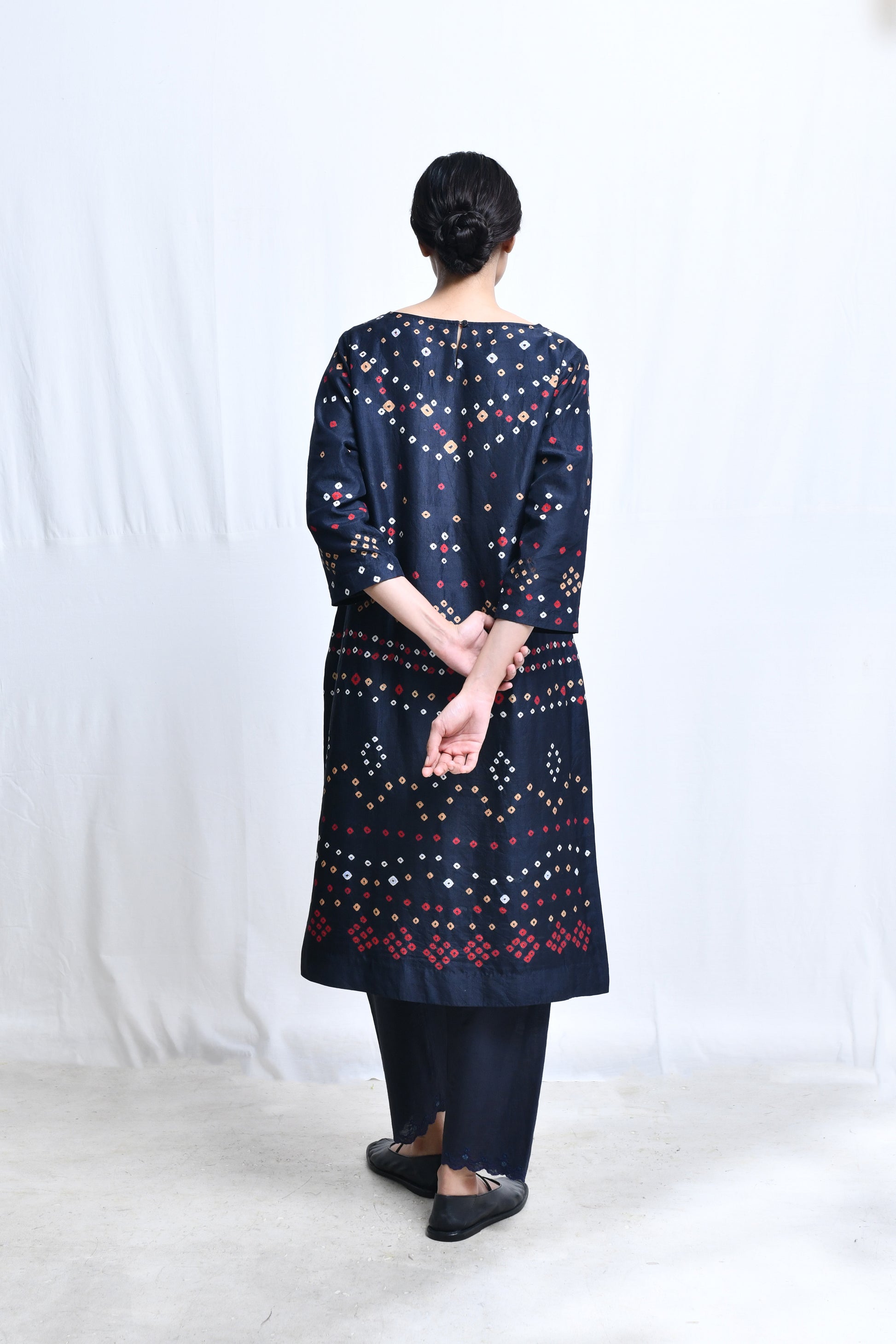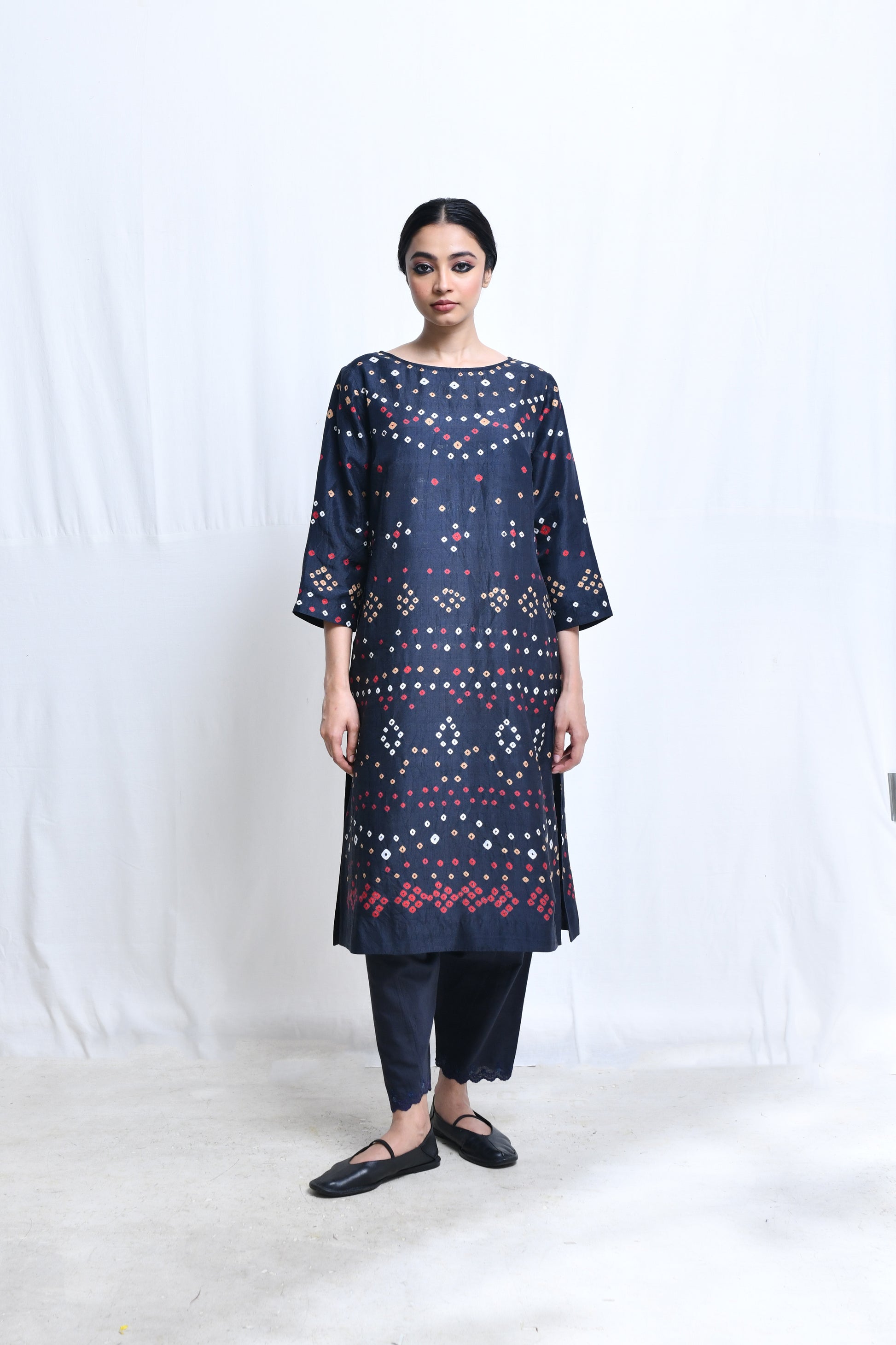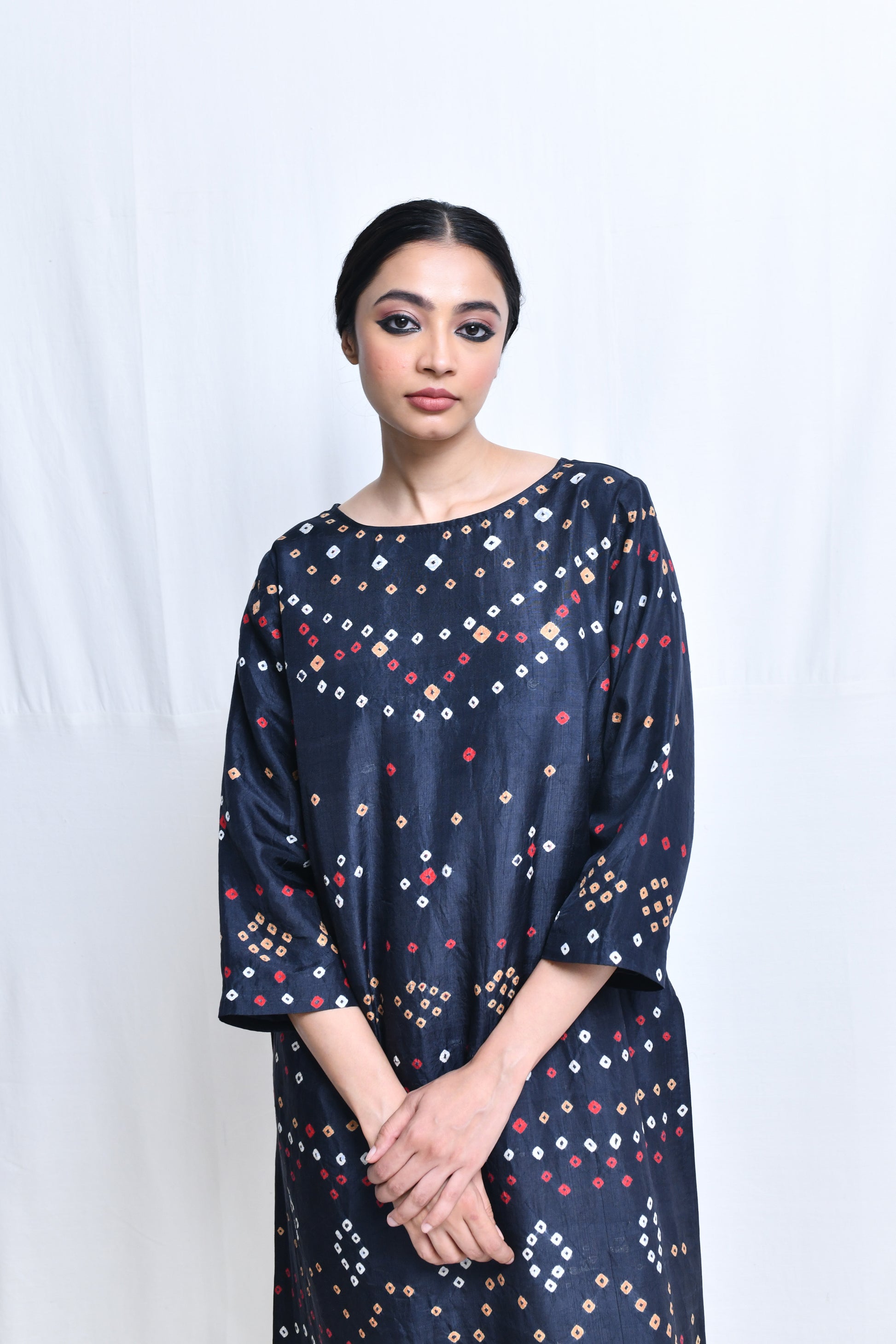 A broad boat neck, straight cut kameez in bandhani dyed homespun silk with quarteer length sleeves, a single button loop closure at the back of the neck, side sits and side in-seam pockets.