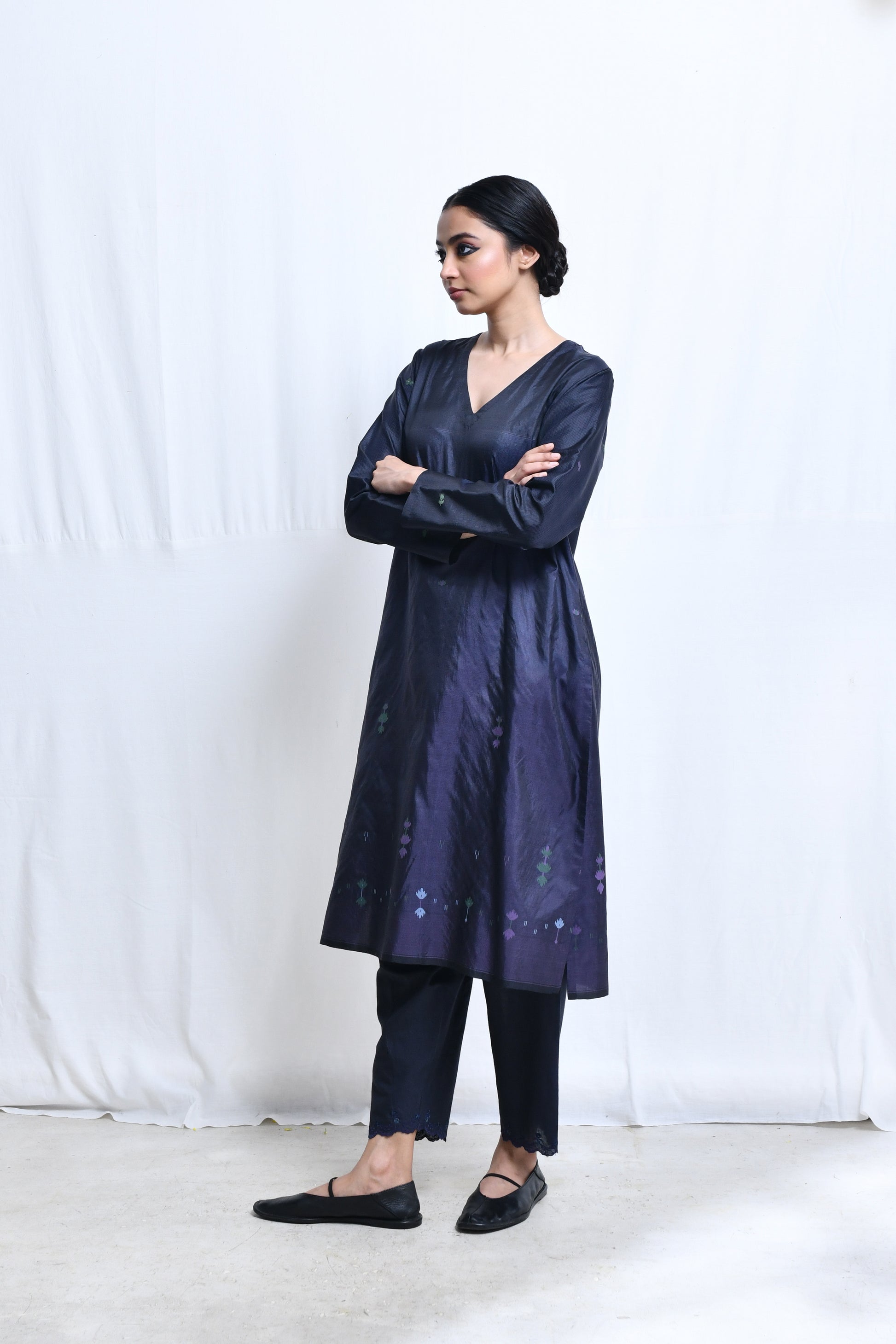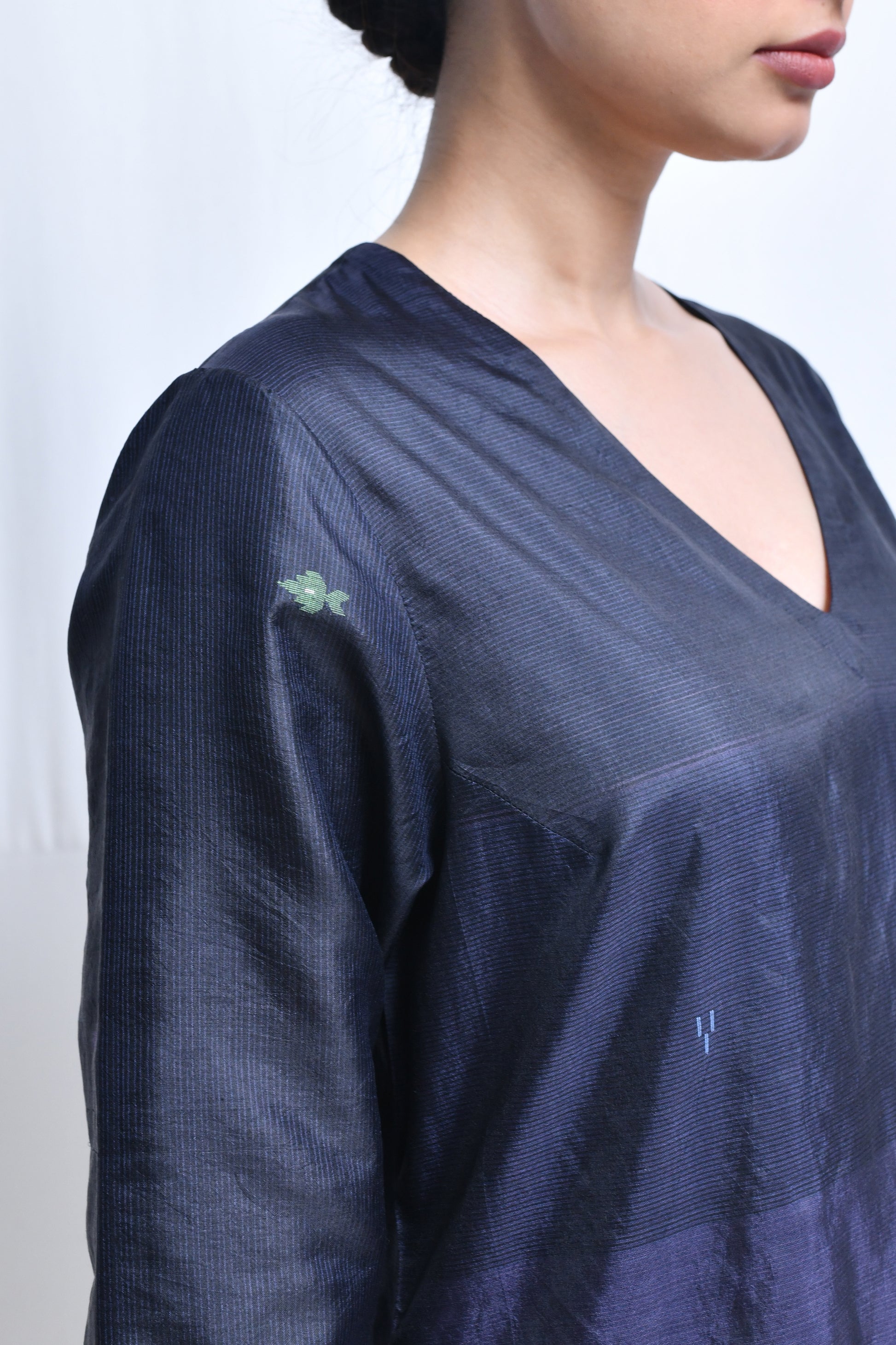 A broad v-neck, straight cut kameez in homespun silk with jamdani with quarter length sleeves, side slits, a selvedge hem and side in-seam pockets.