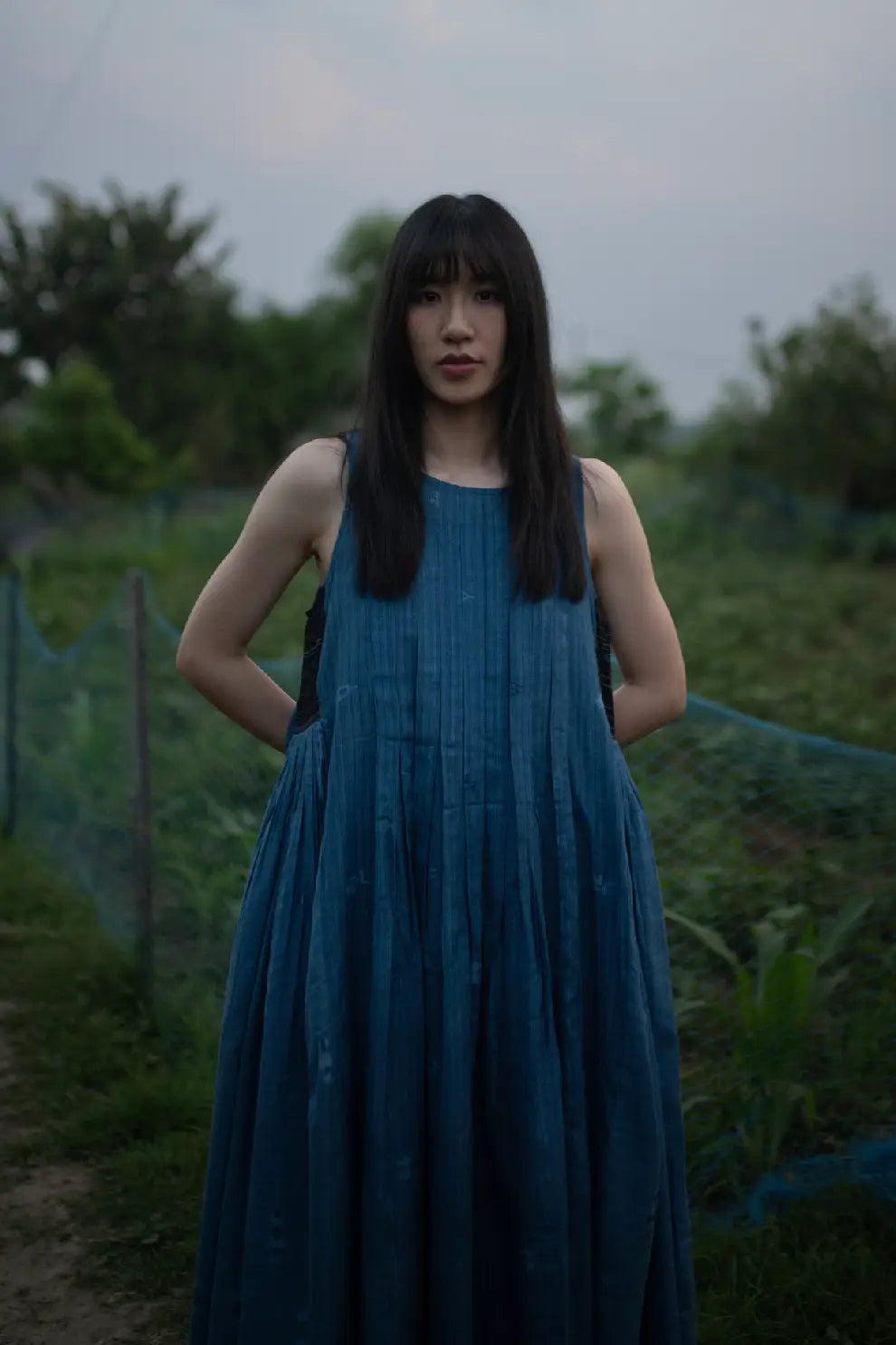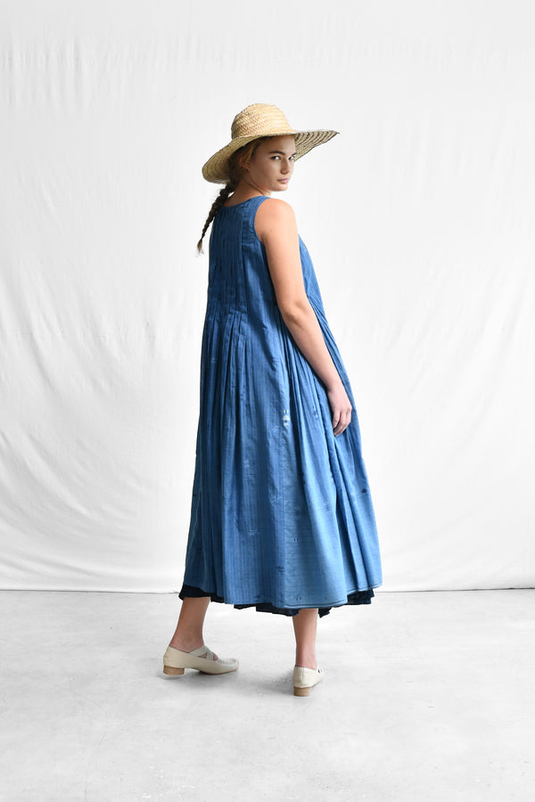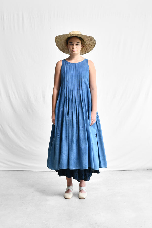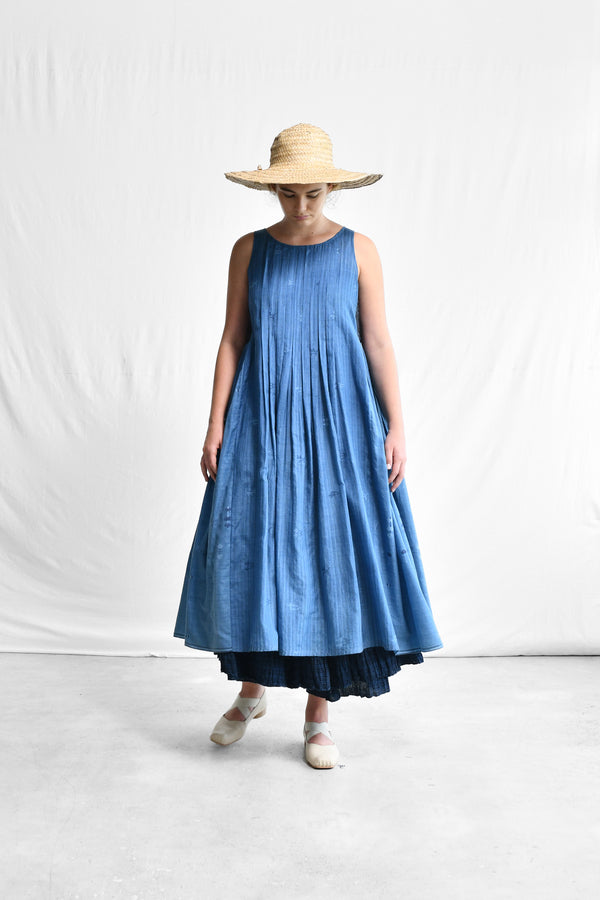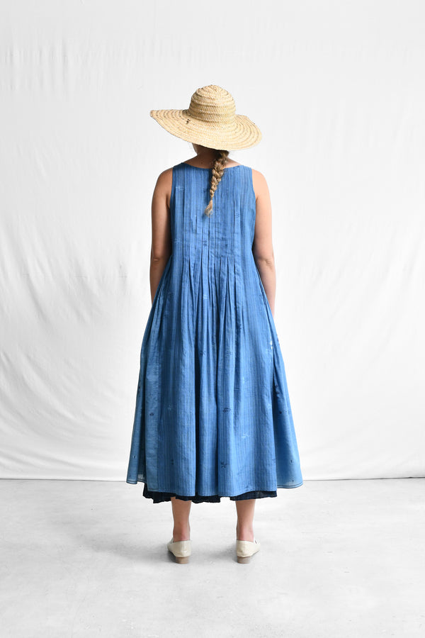A sleeveless, relaxed round neck, midi length dress in handwoven cotton silk jamdani in natural indigo with front and back panelled box pleats, striped armhole patches, gathers at the side yoke, and side in-seam pockets.