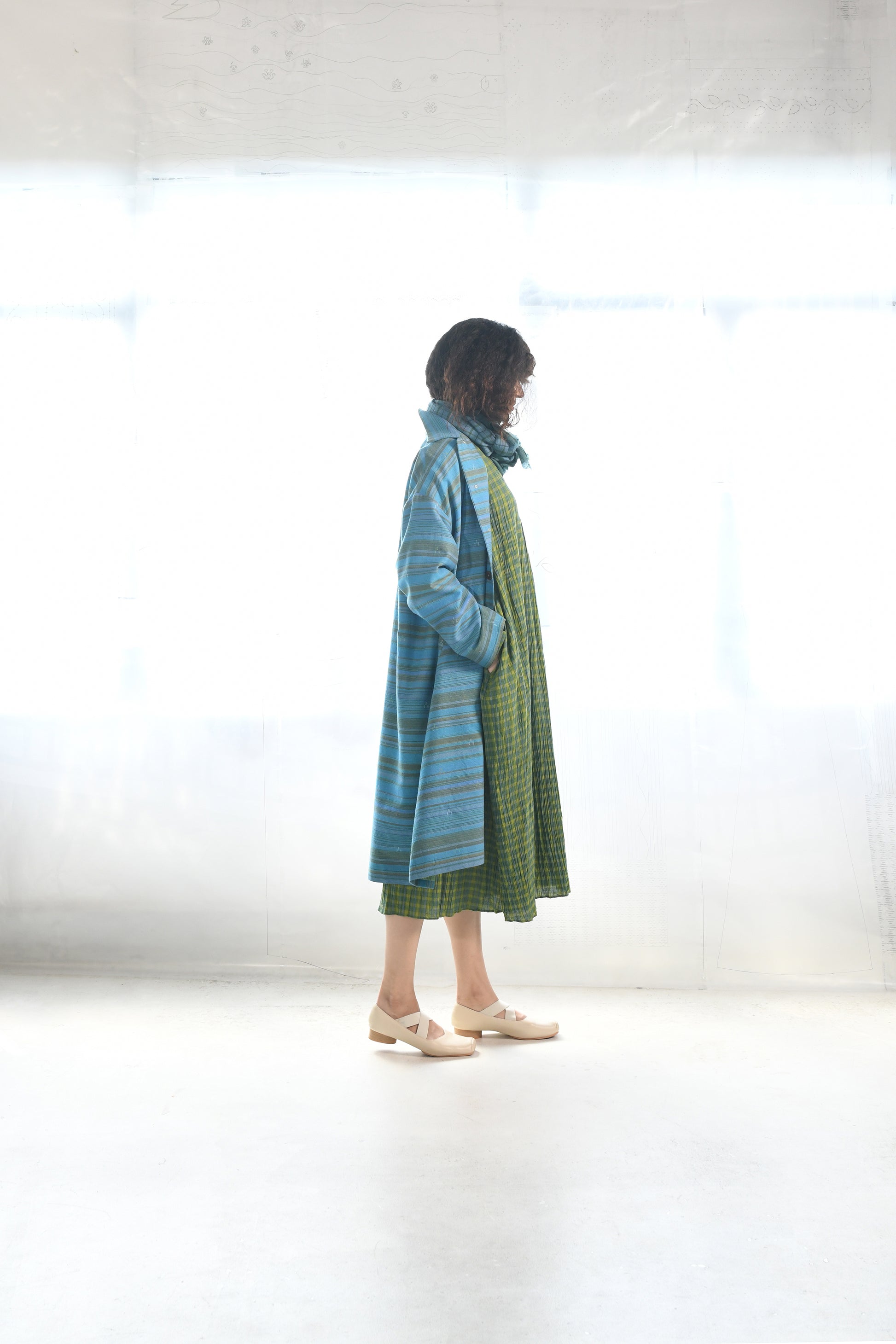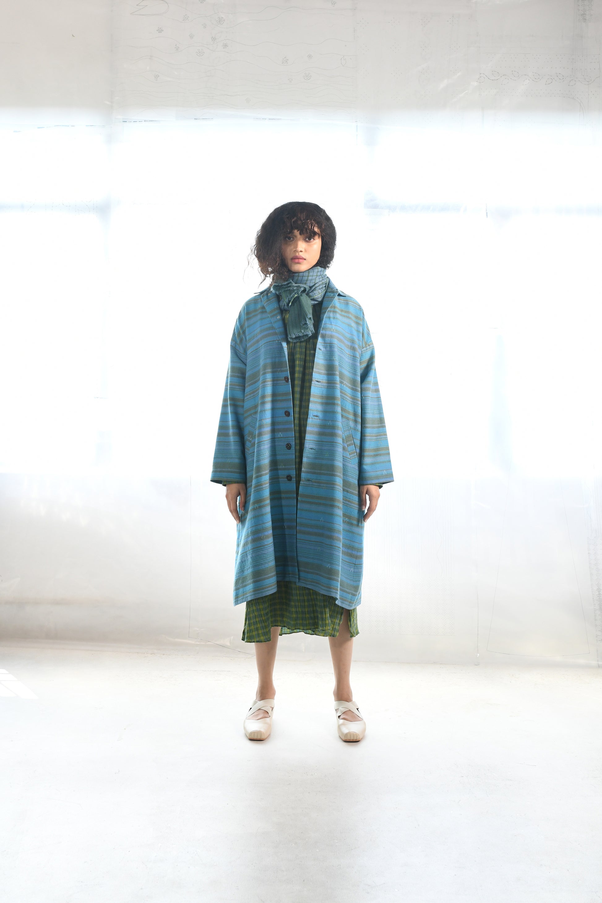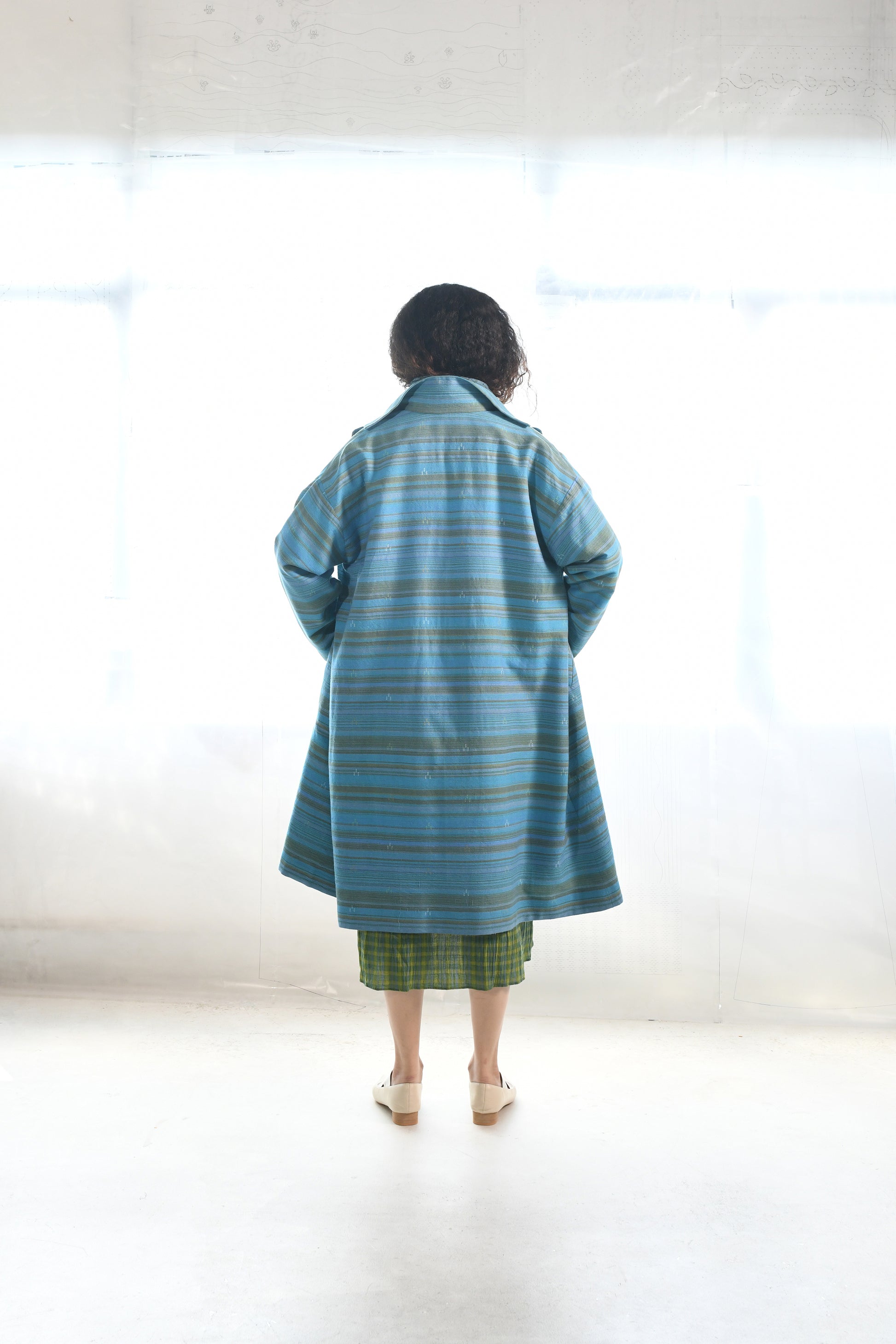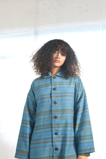 An A-line, front open jacket in handwoven striped wool cotton jamdani brocade with a button down closure, shirt collar, full jacket sleeves and front welt pockets, fully lined with handwoven cotton stripes.