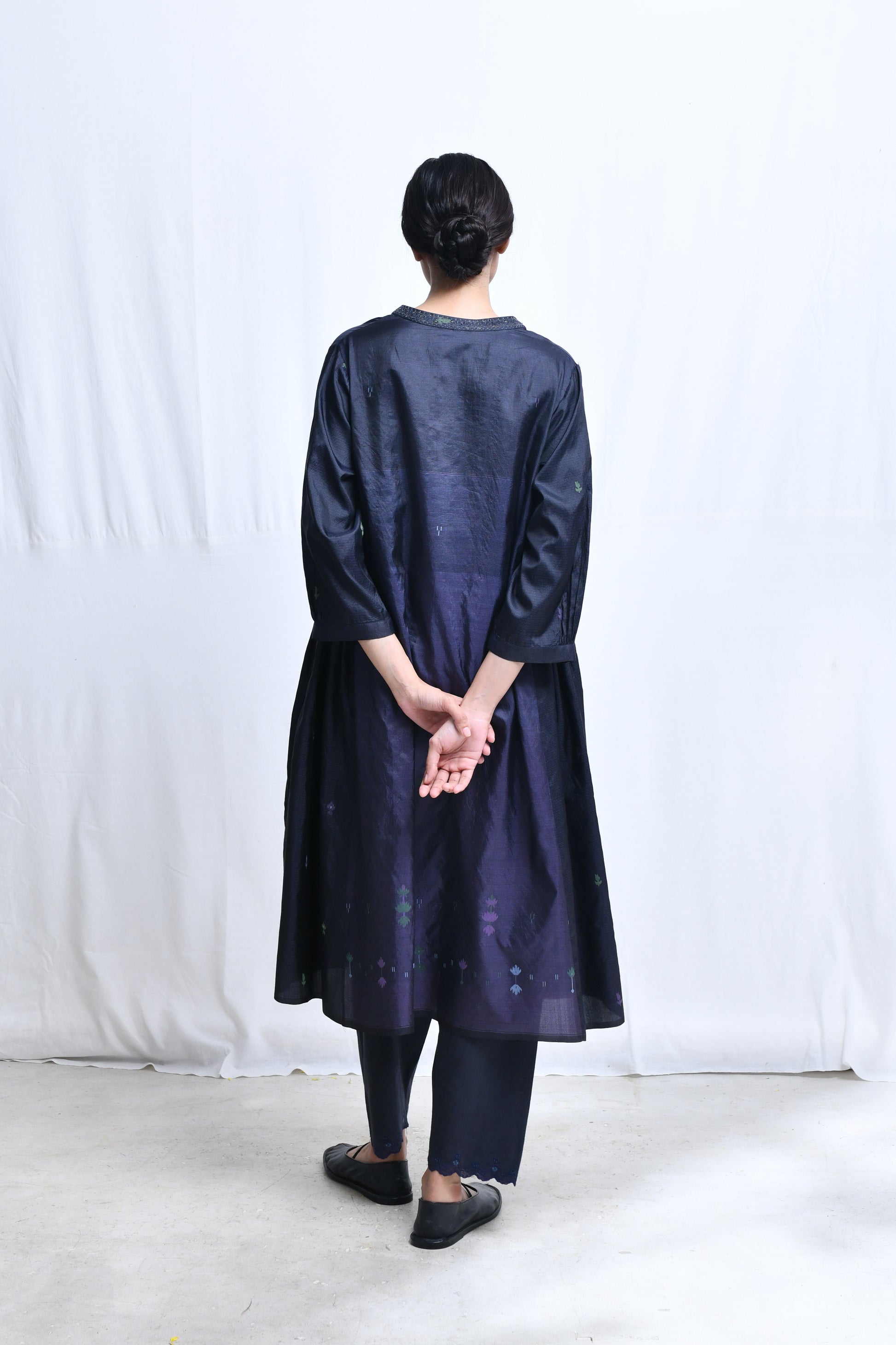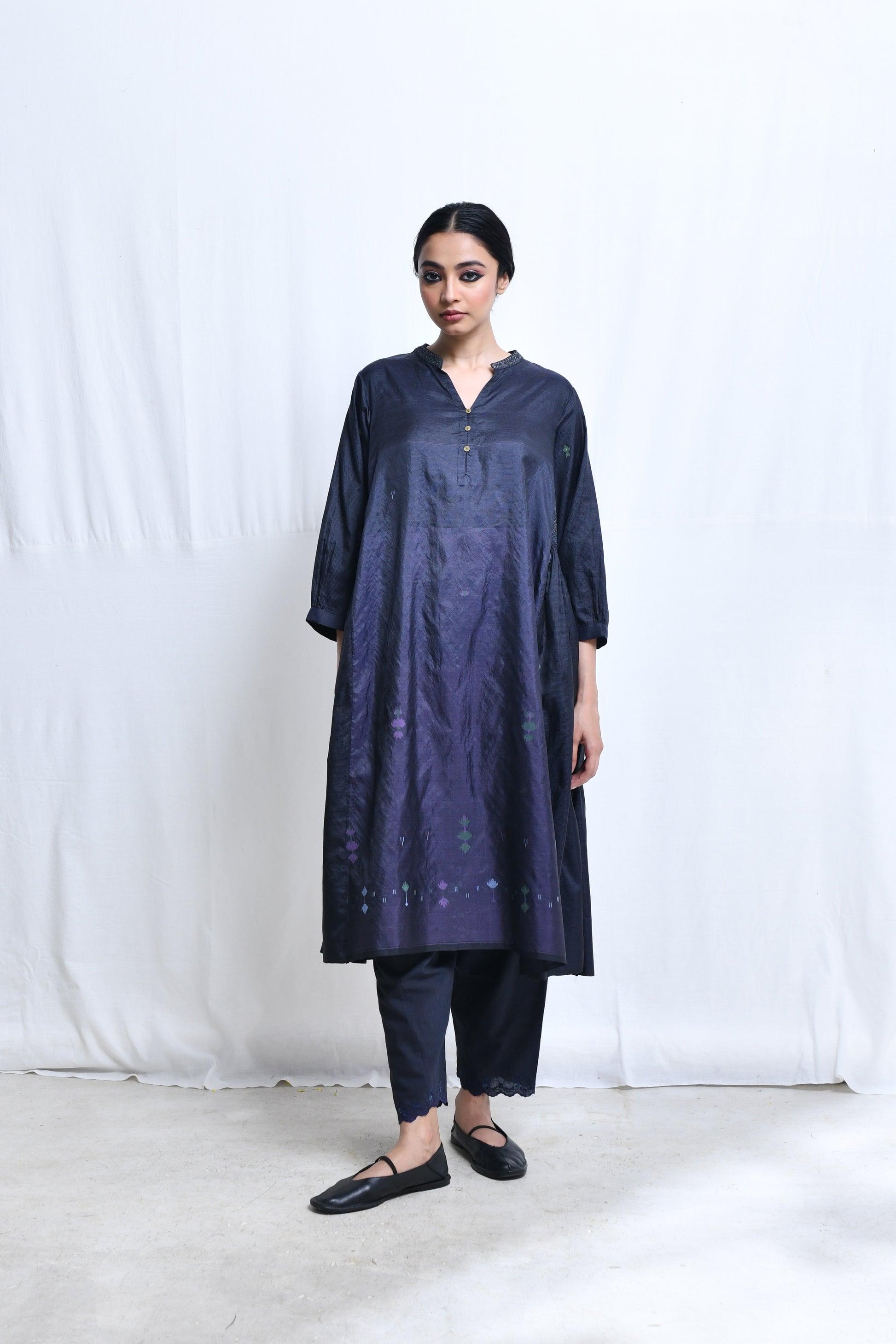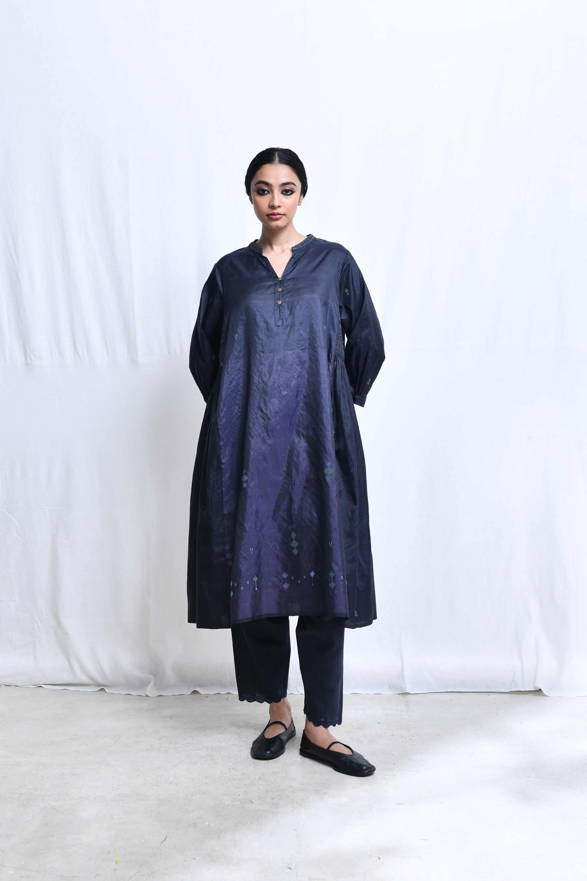 A multi panelled, flair kurta in panels of homespun silk with jamdani with a broad embroidered band collar neckline, a short front button closure, quarter length sleeves, selvedge hem and side in-seam pockets.
