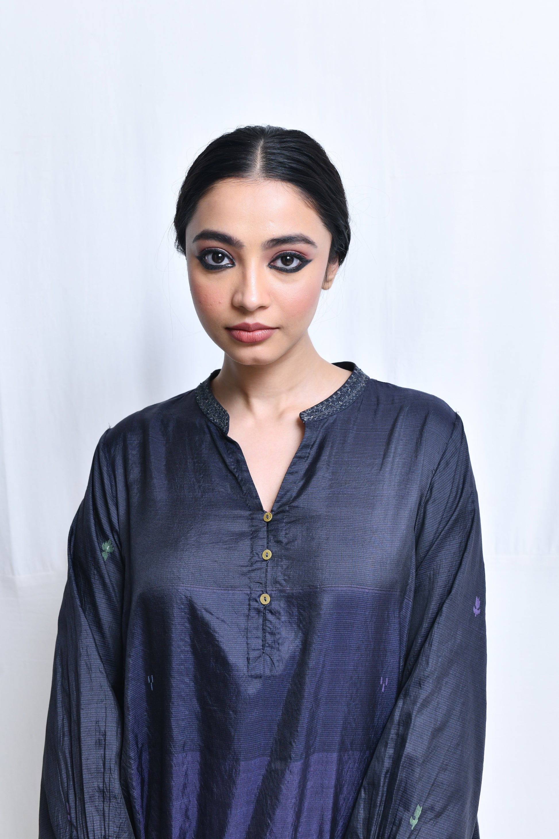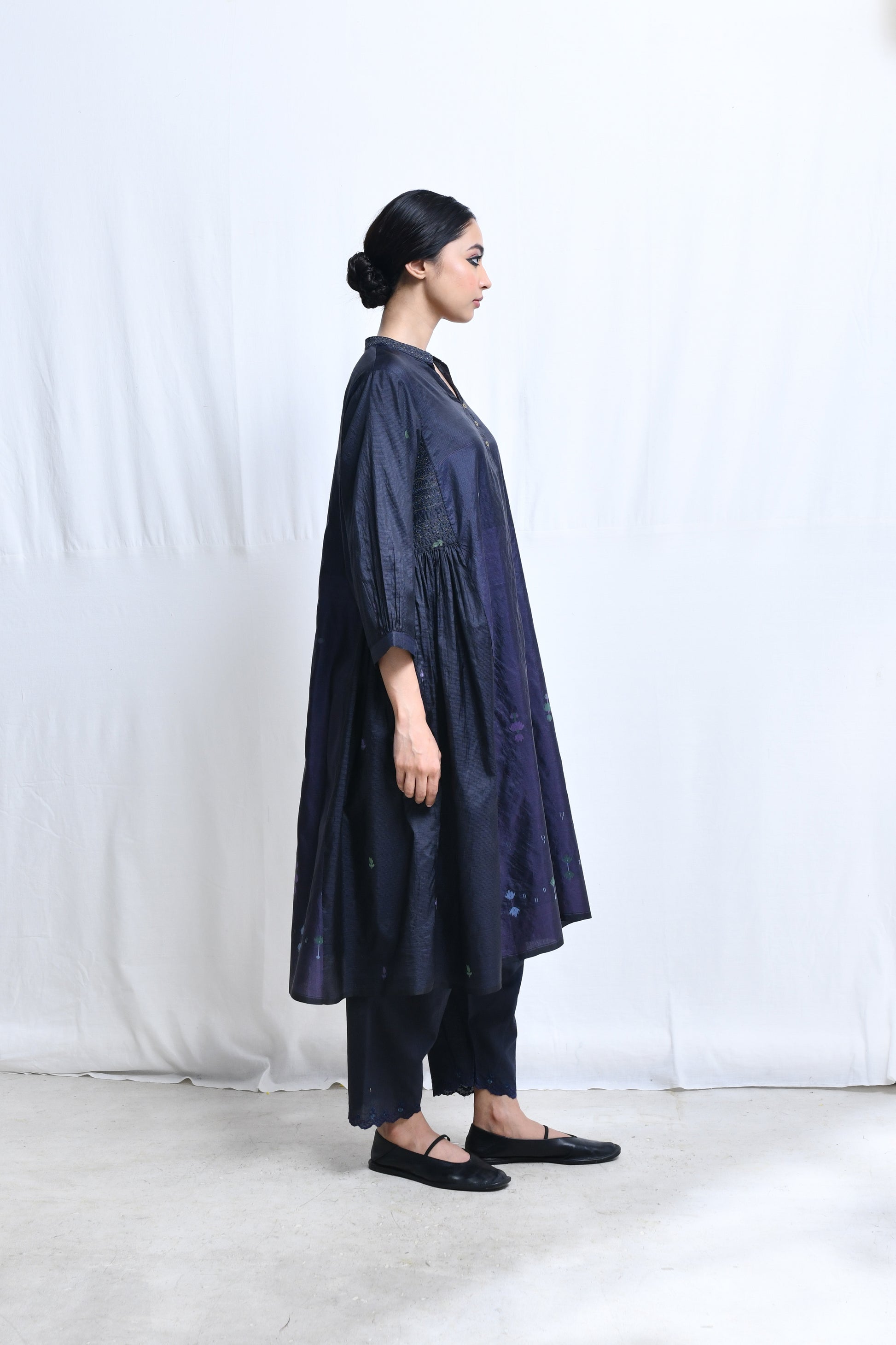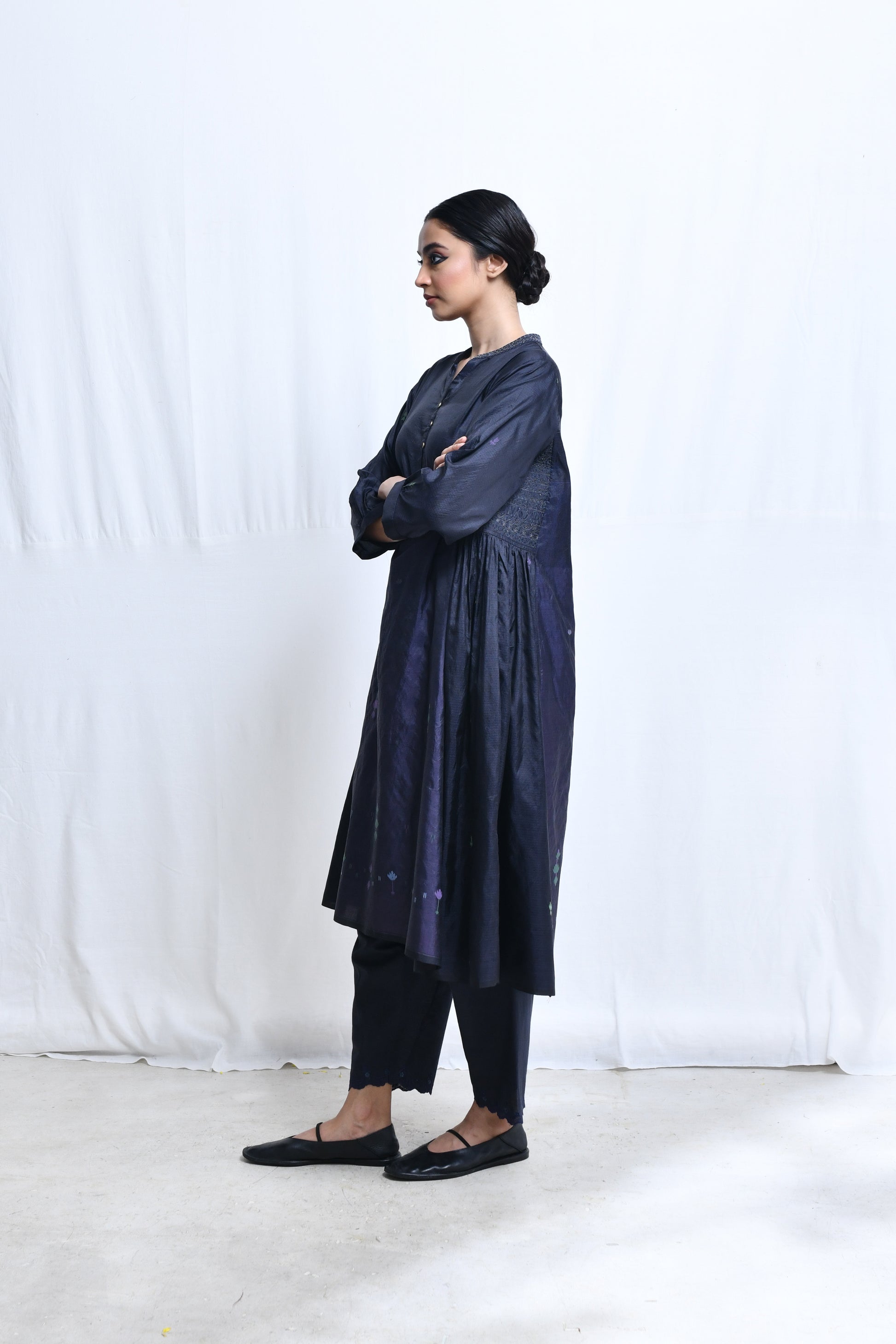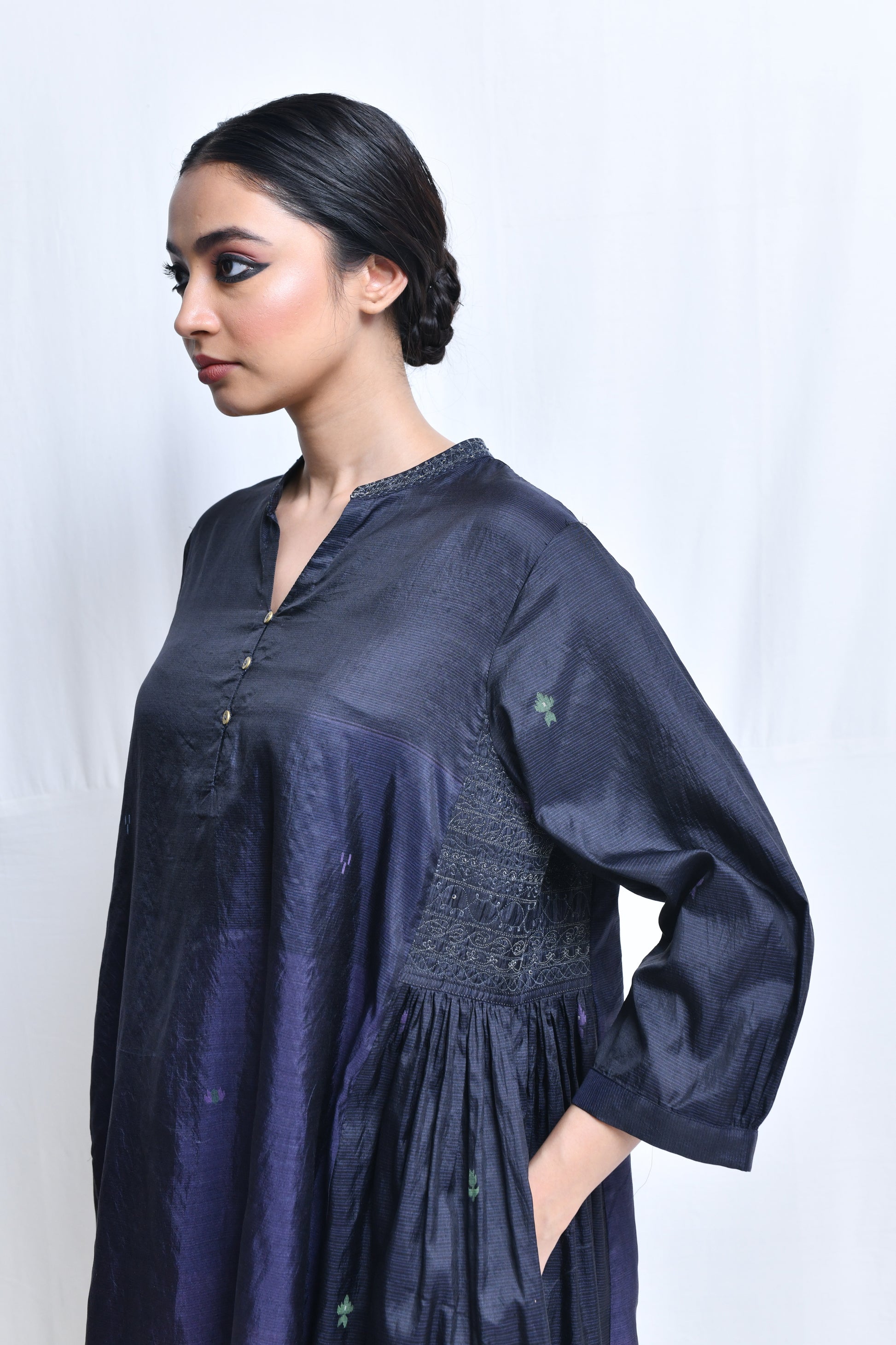 A multi panelled, flair kurta in panels of homespun silk with jamdani with a broad embroidered band collar neckline, a short front button closure, quarter length sleeves, selvedge hem and side in-seam pockets.