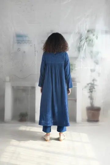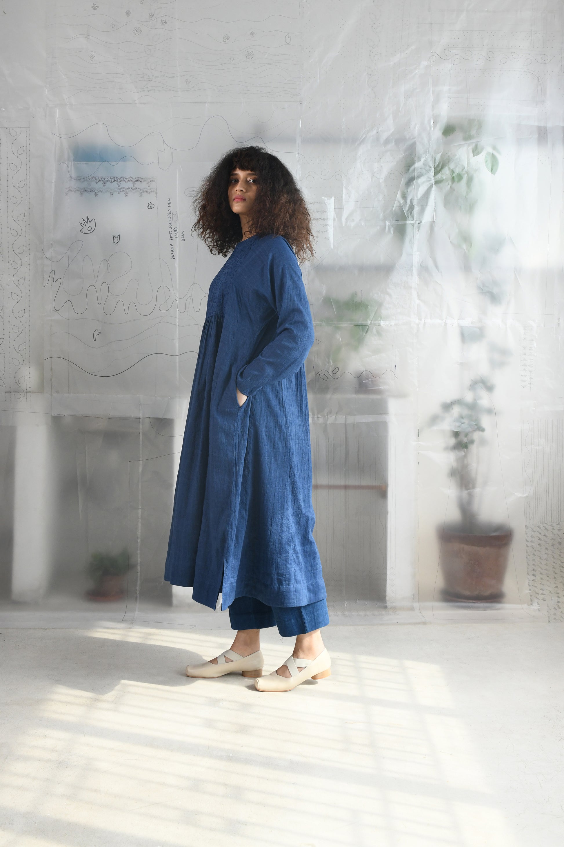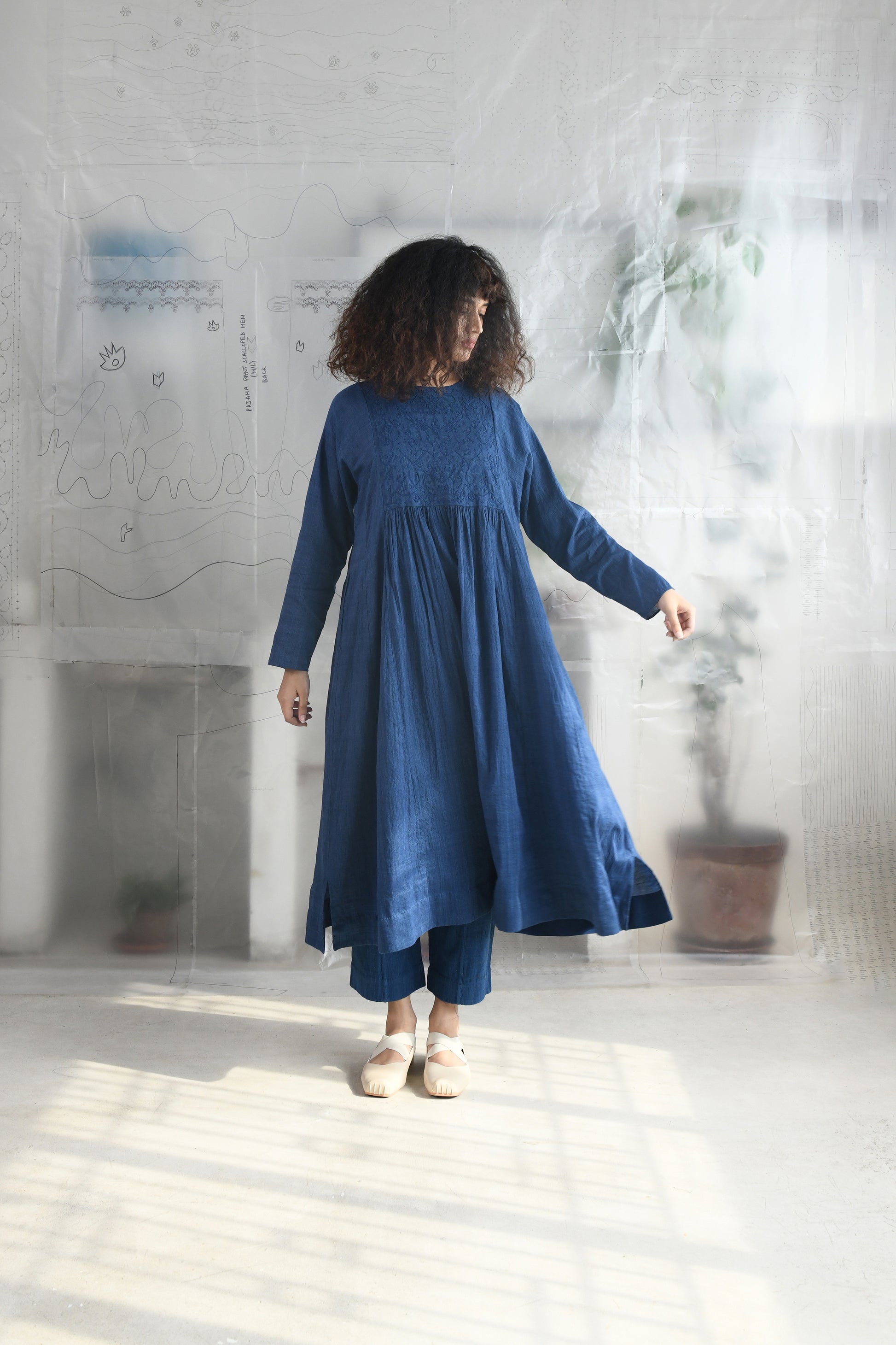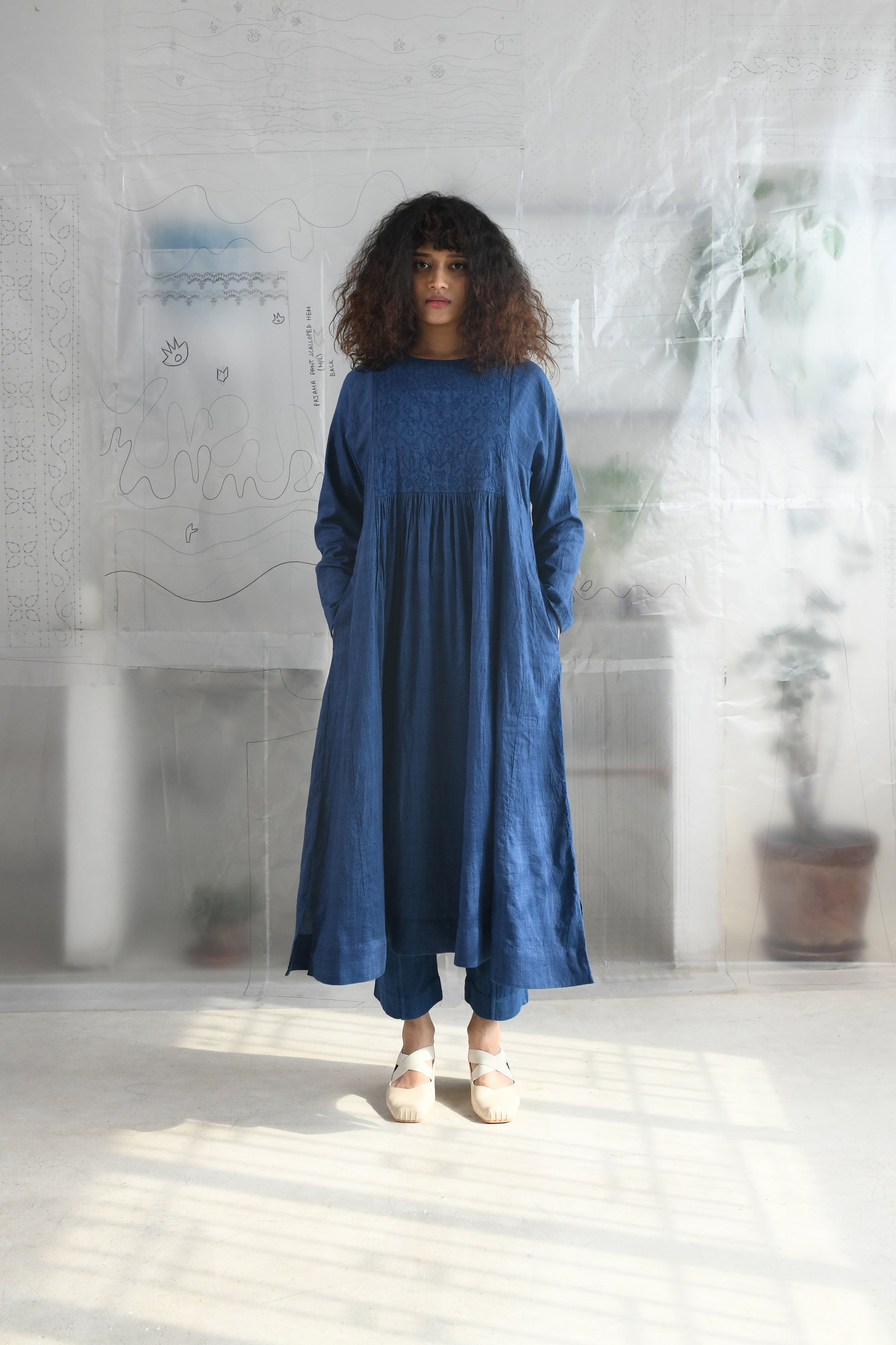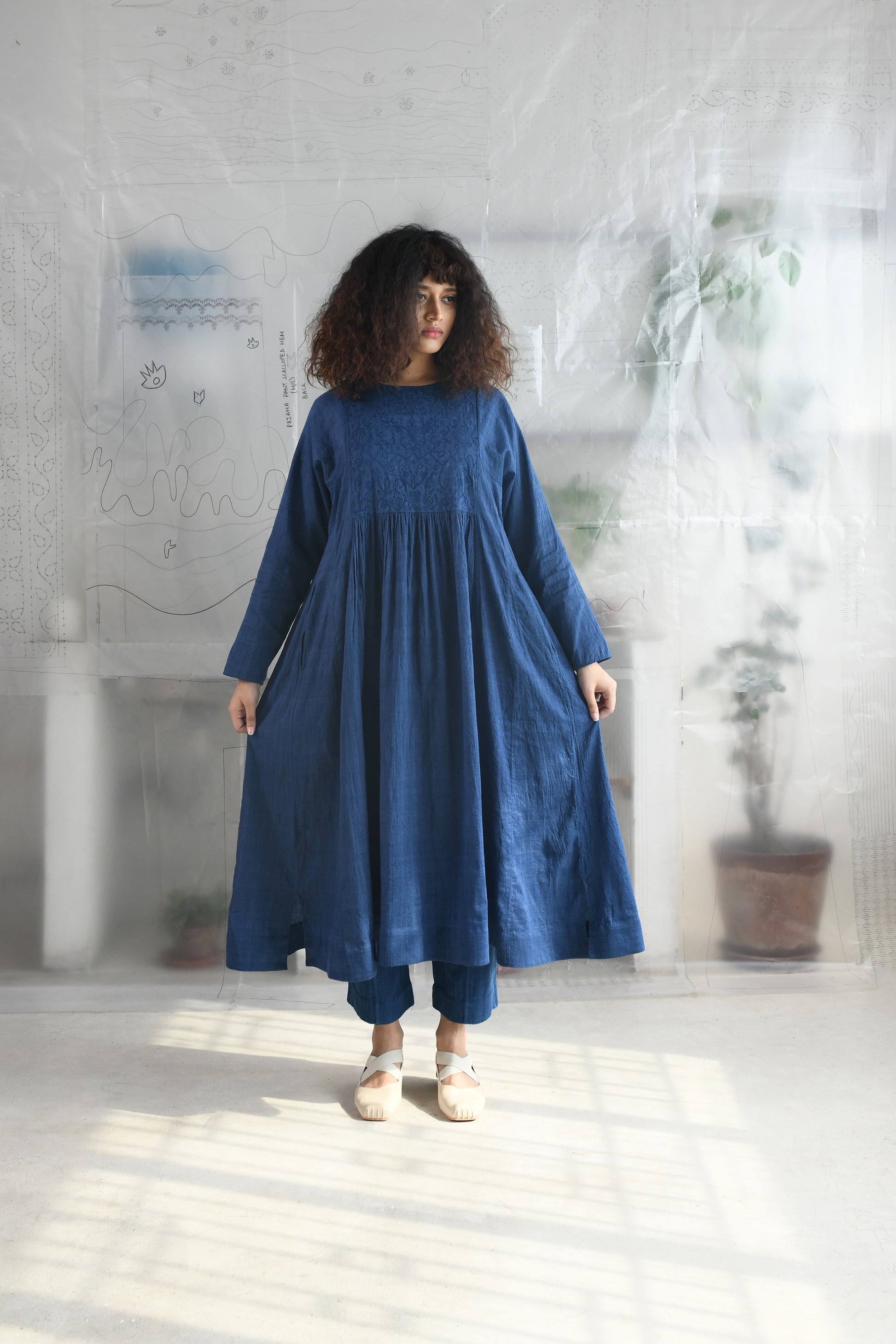 A mutli panel, flair dress in handwoven very fine wool cotton with a round neck, back slit opening with a single button loop closure, front and back yoke detailed with tonal aari embroidery followed by gathered flair panels, full length sleeves and side in-seam pockets.